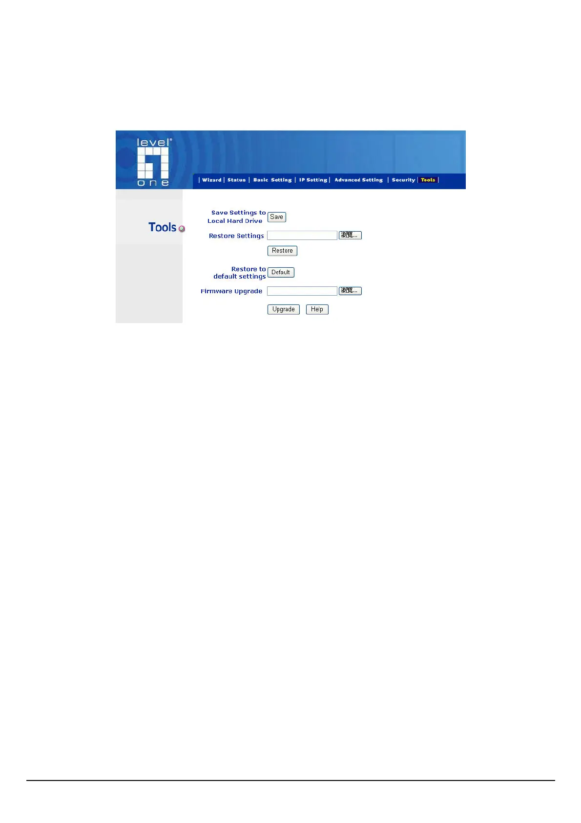 Four functions are provided in this page, Backup, Restore Settings, Restore default settings and
