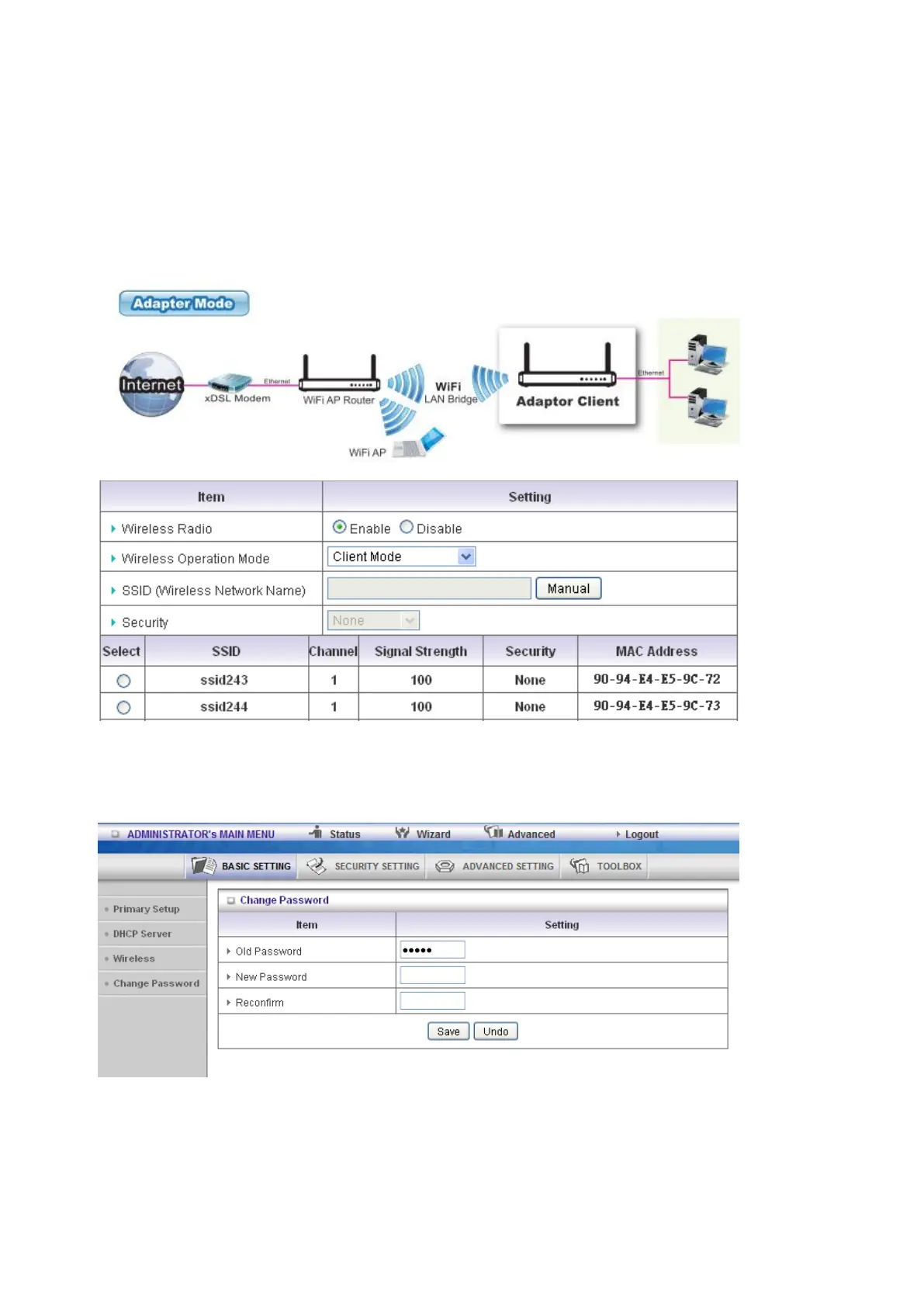 If set to Adapter Mode (Client mode), this device can work like a wireless station when it’s