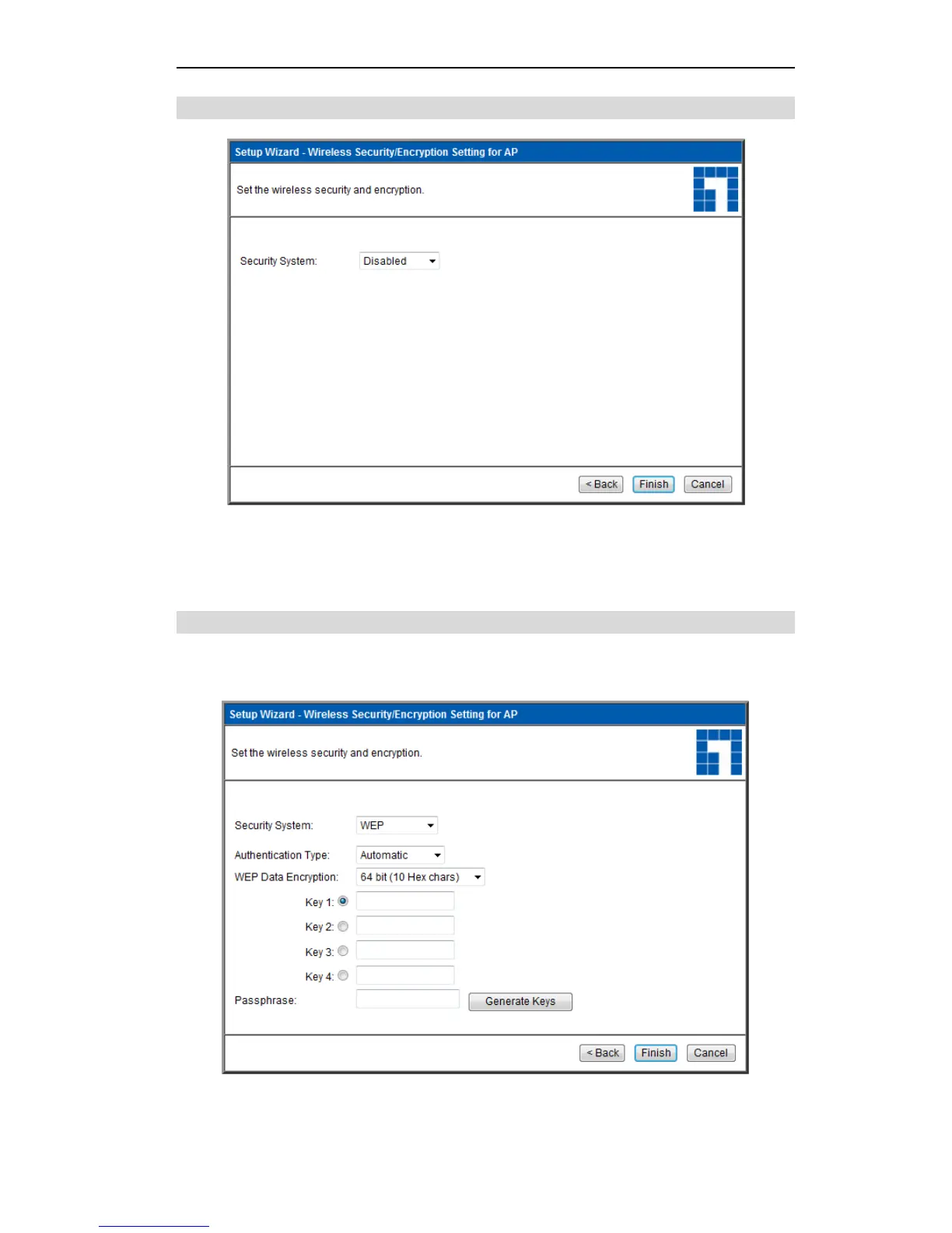 LevelOne WAP-6011 - Security Settings - None; Security Settings - WEP