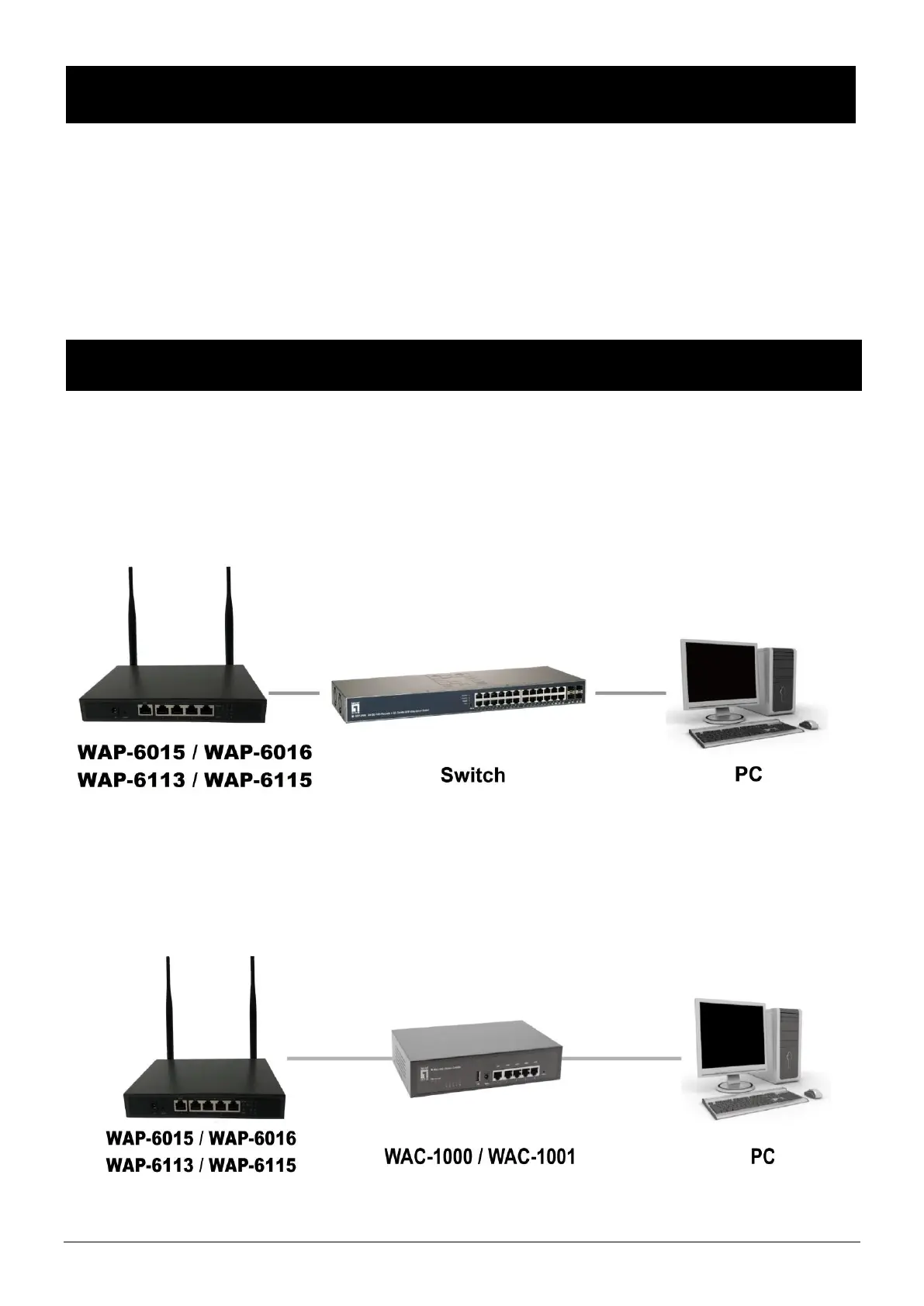 WAP-6016 / WAP-6113 / WAP-6115, and the other end into a port on a switch.