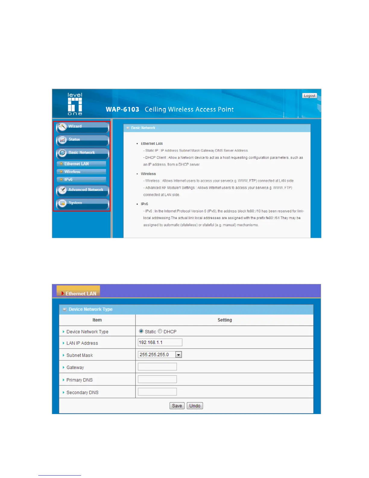 You can enter Basic Network for Ethernet LAN, Wireless and IPv6 settings in this web