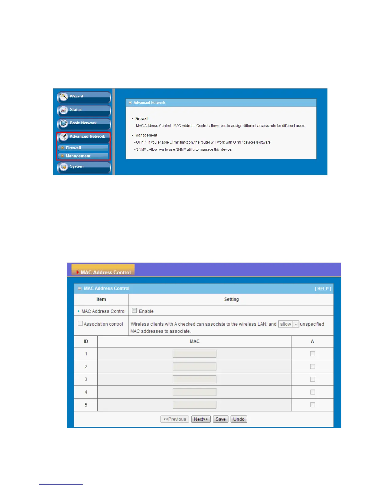 1. MAC Address Control: Check “Enable” to enable the “MAC Address Control”. All