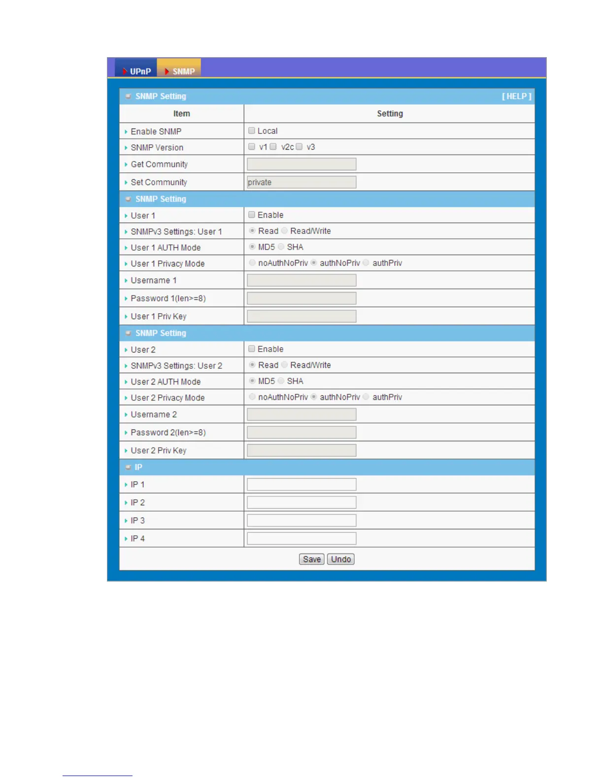 5. SNMPv3 Settings: User 1/2: This device supports up to two SNMP management