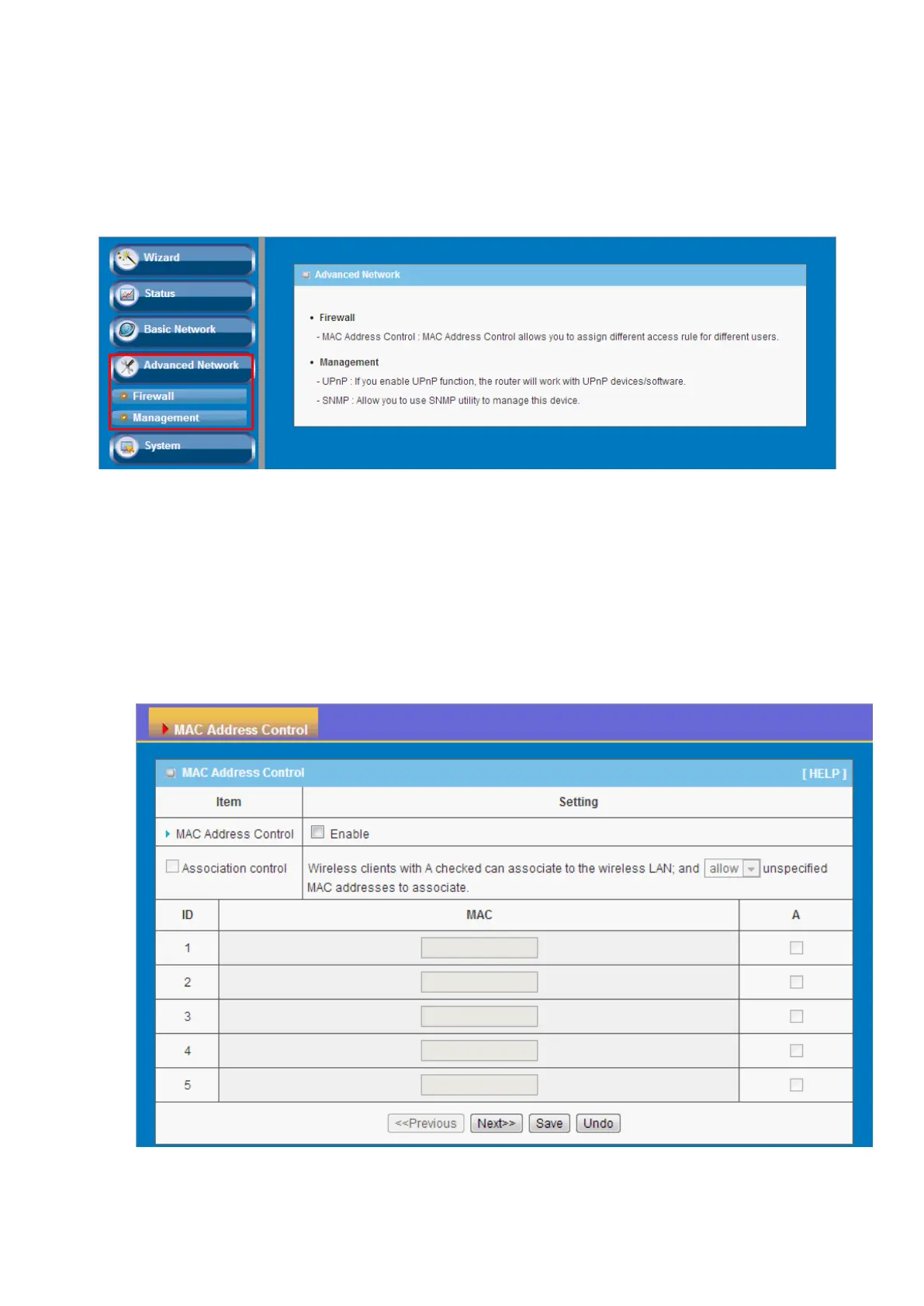 1. MAC Address Control: Check “Enable” to enable the “MAC Address Control”. All