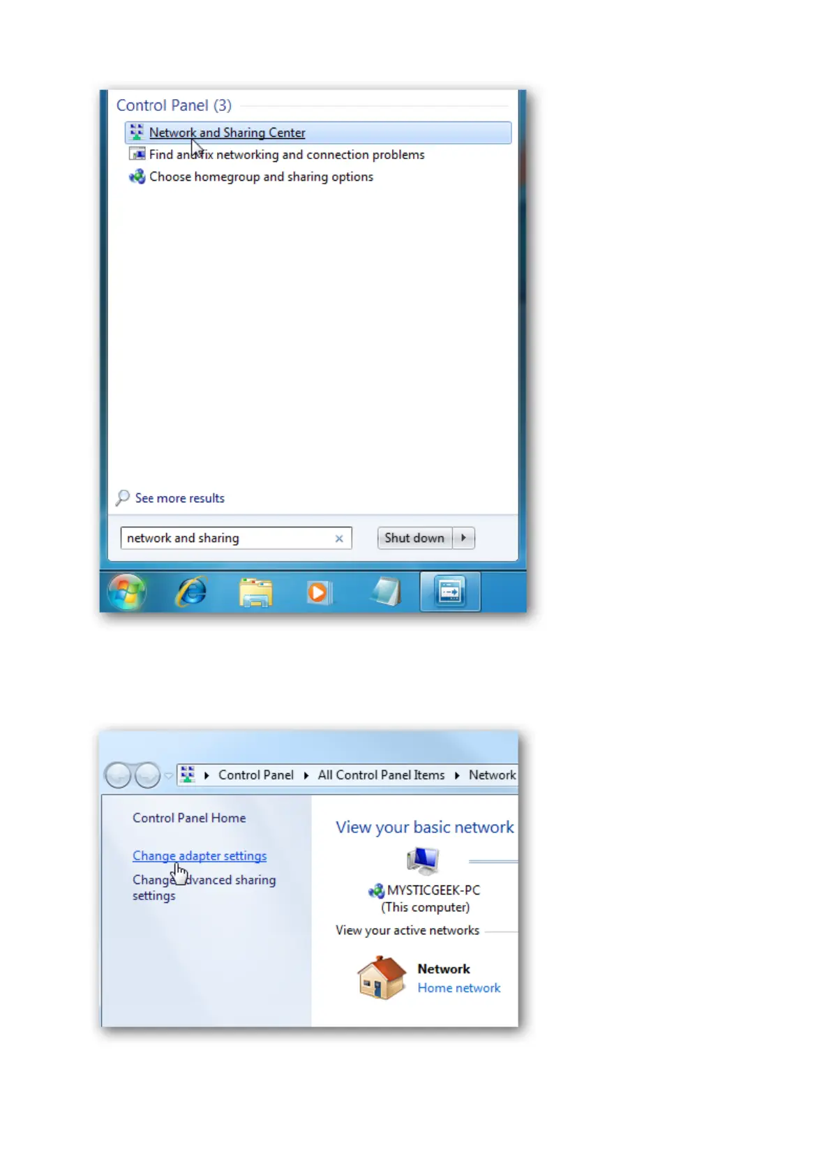 Then when the Network and Sharing Center opens, click on Change adapter settings.