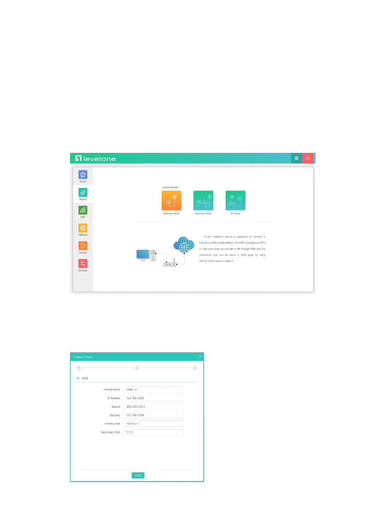 Click Wizard in Status page, will pop up following page to configure the operation mode and there
