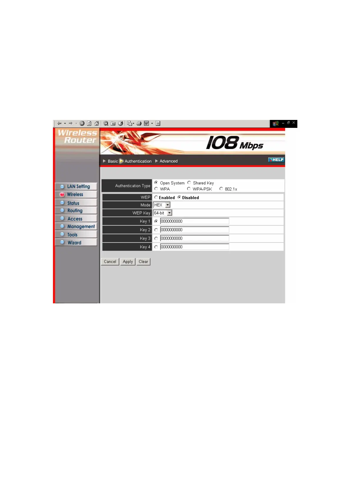 Key 1 ~ Key 4: Enables you to create an encryption scheme for Wireless LAN