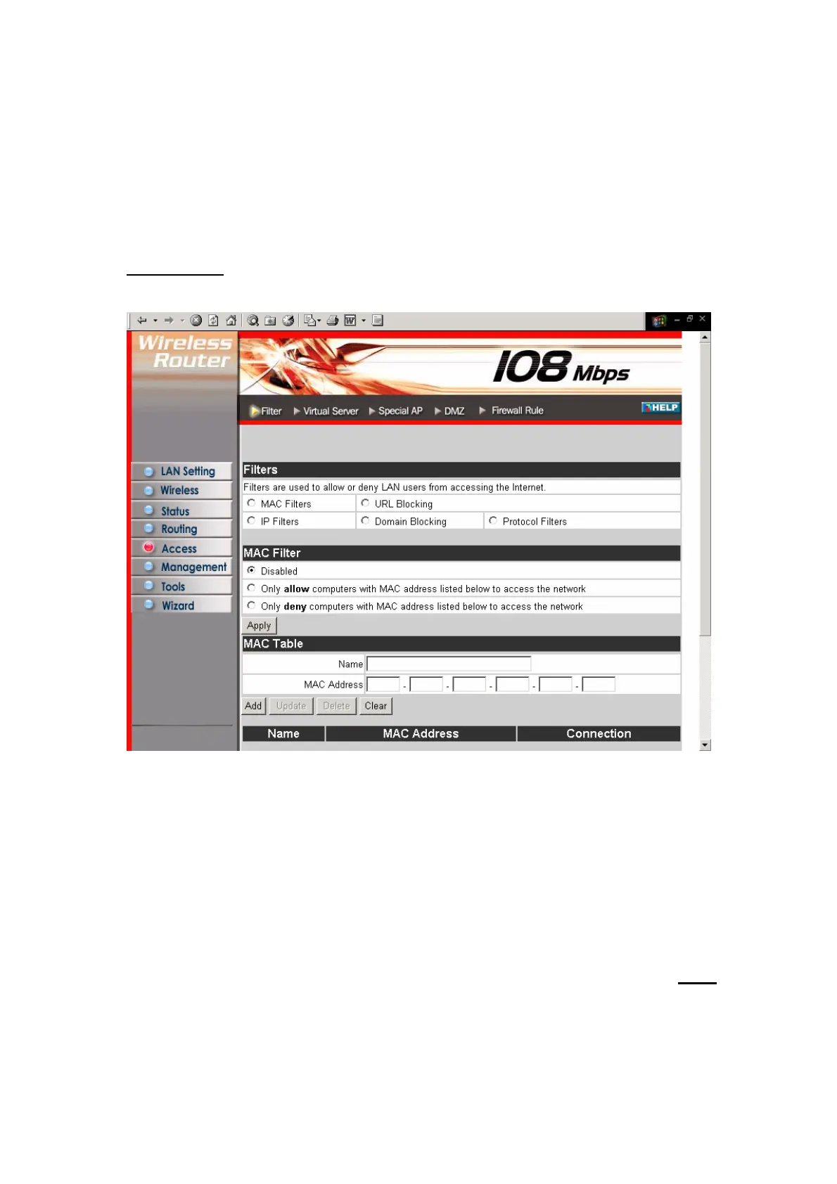 MAC Filter: Enables you to allow or deny Internet access to users within the LAN