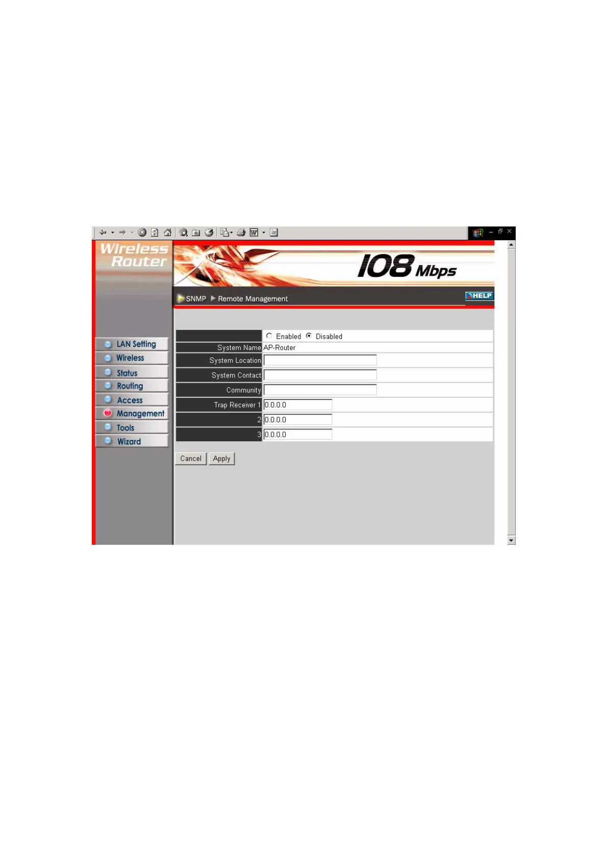 Management enables you to set up SNMP and Remote Management feature.