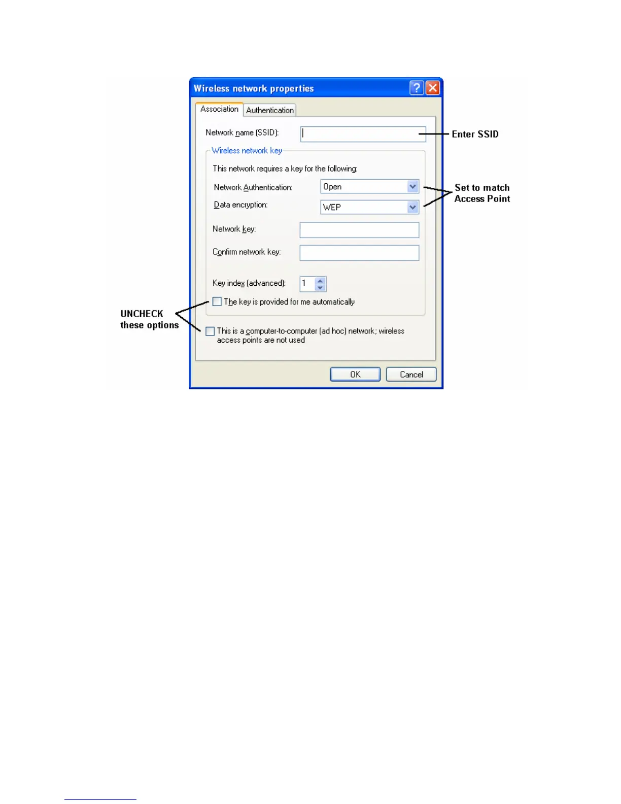 • Set Network Authentication and Data Encryption to match