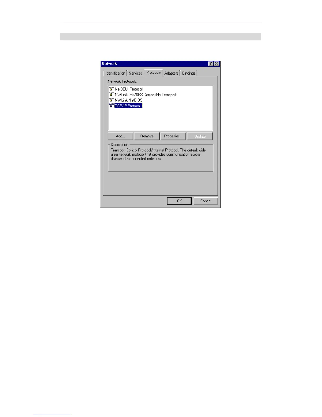 1. Select Control Panel - Network, and, on the Protocols tab, select the TCP/IP