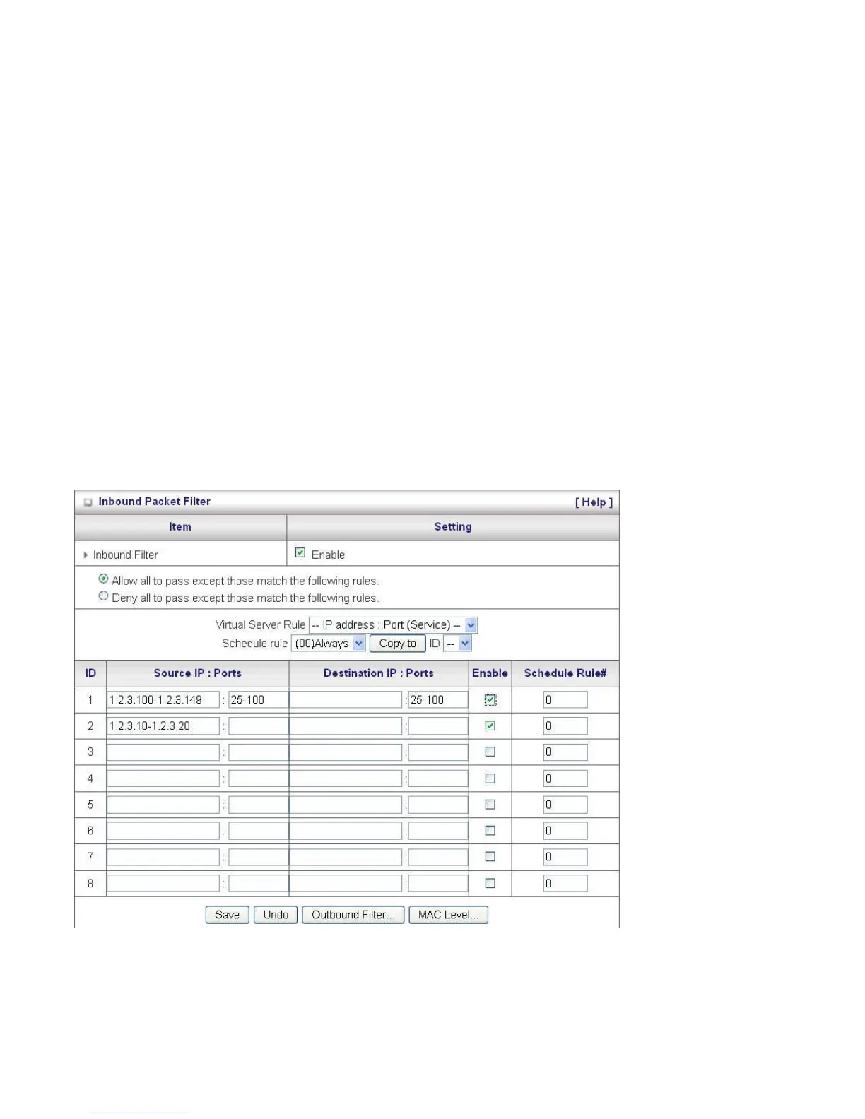 To access the Inbound Packet Filter page, click on Inbound Filter on the bottom of the page. All