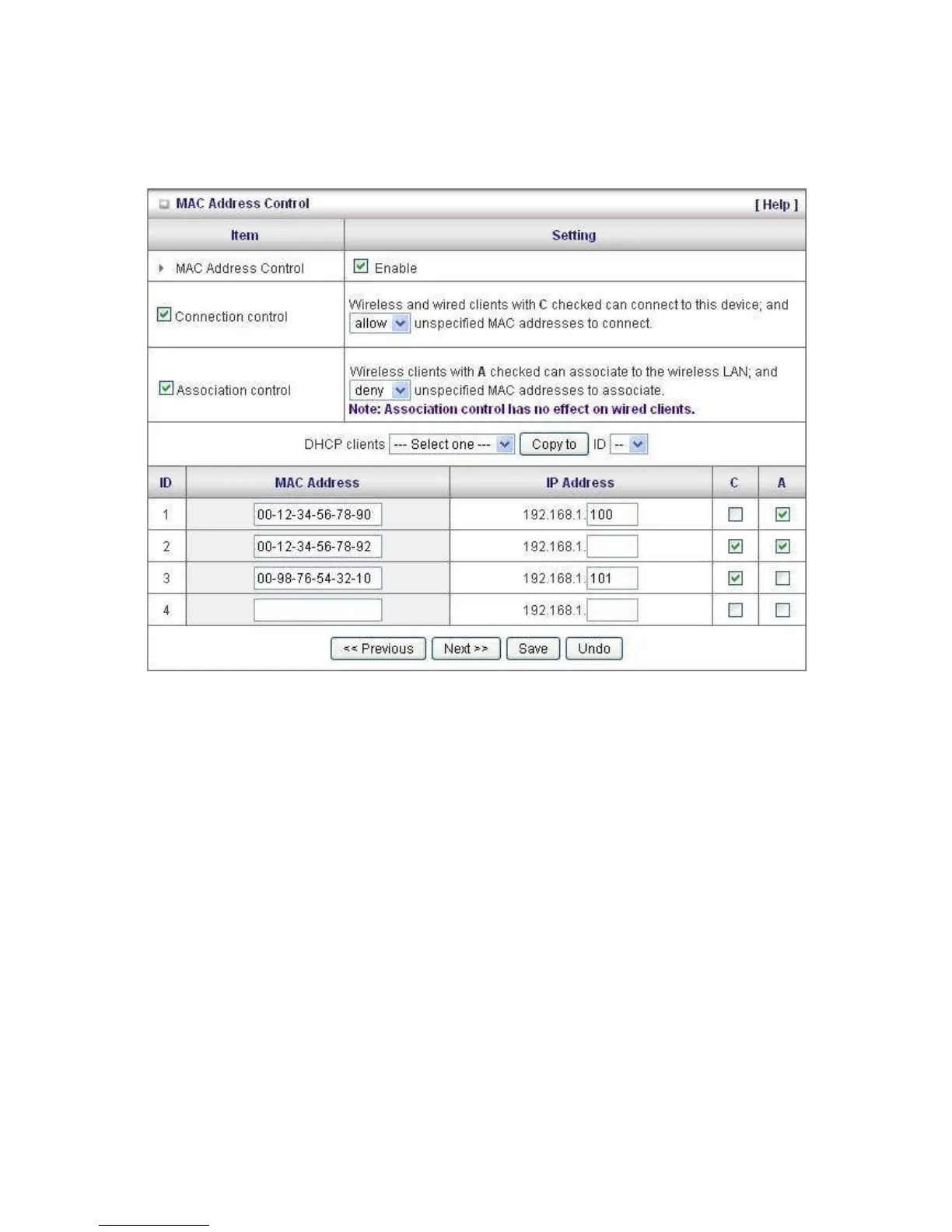 MAC Address Control allows you to assign different access right for different users and to assign a