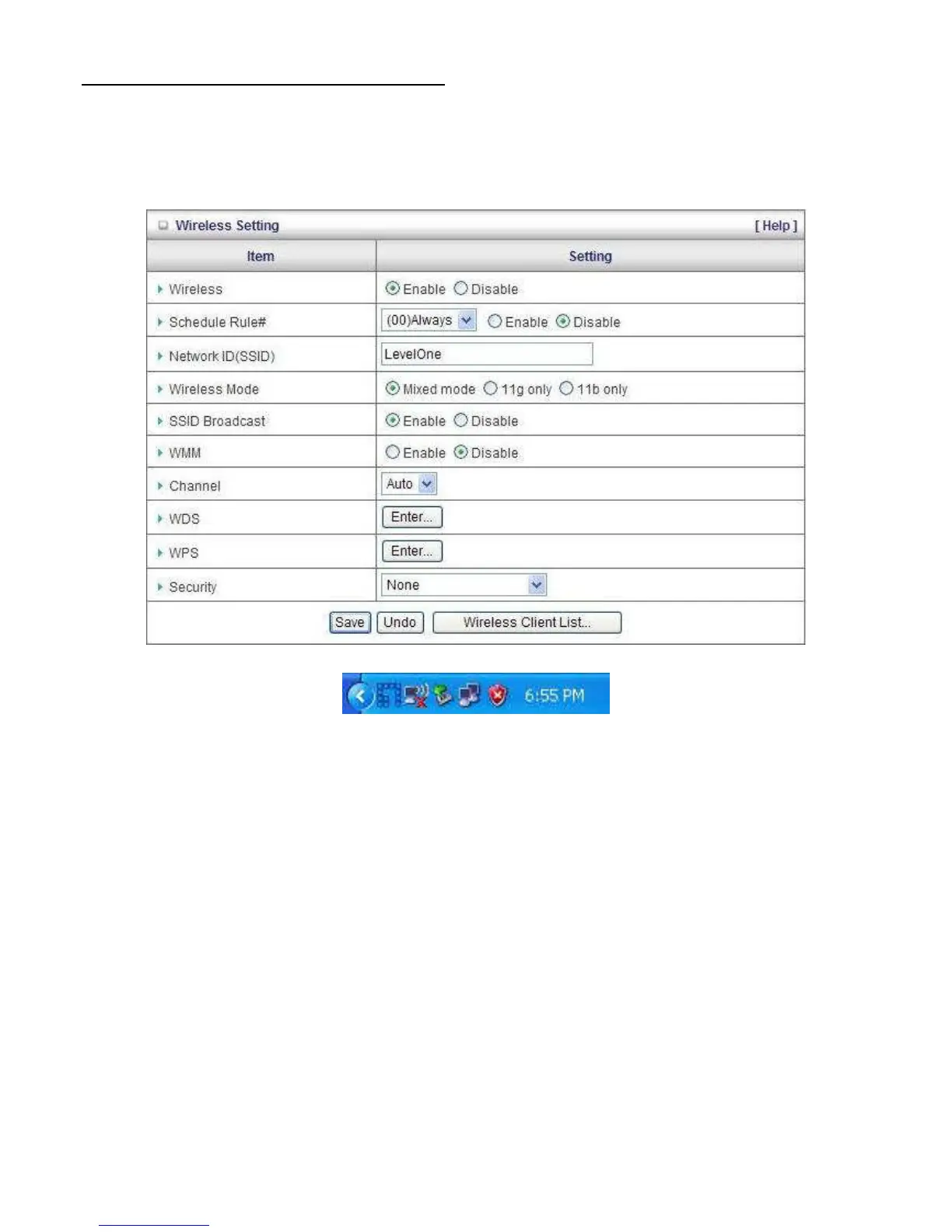 configuration of wireless router. The default is below: