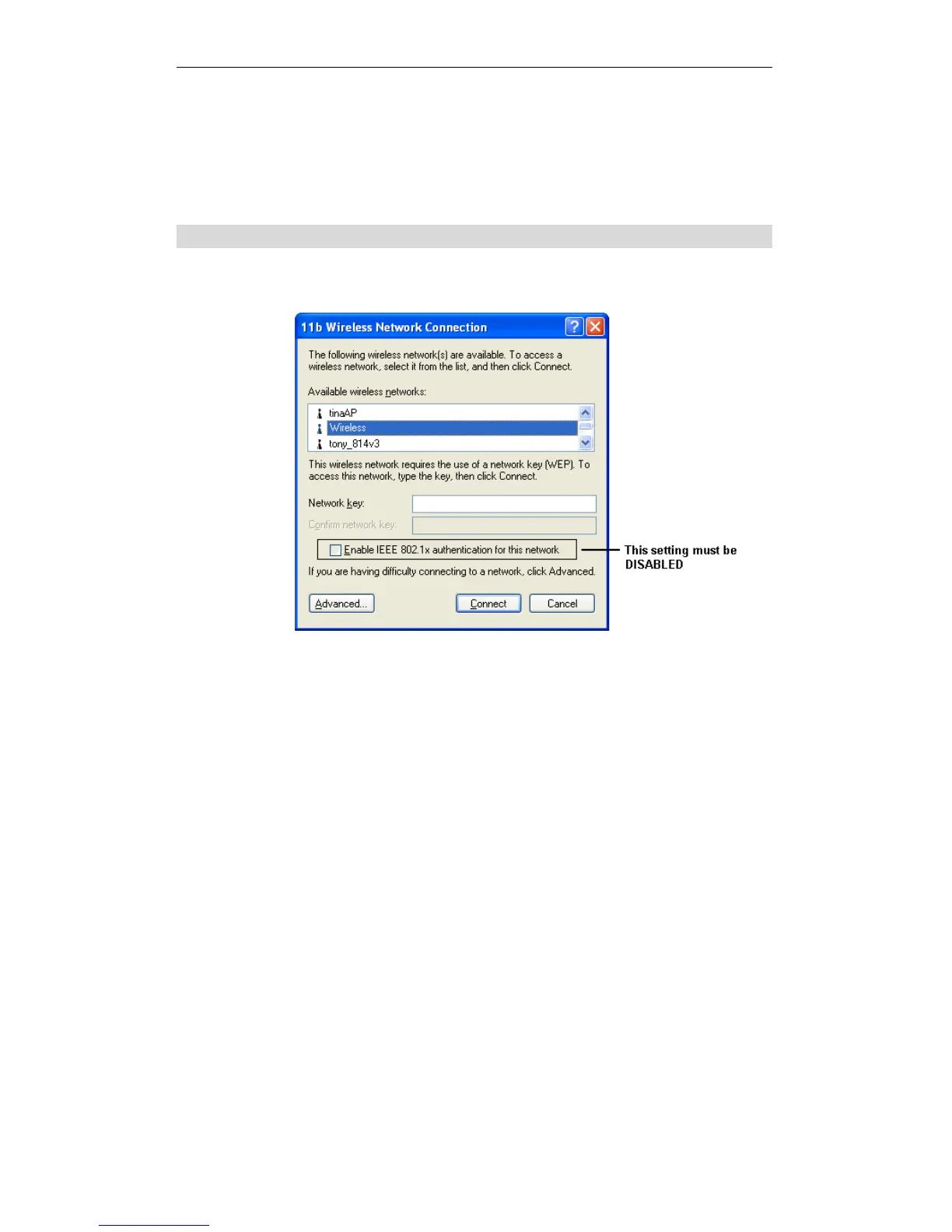 Disable the checkbox Enable IEEE 802.1x authentication for this network.