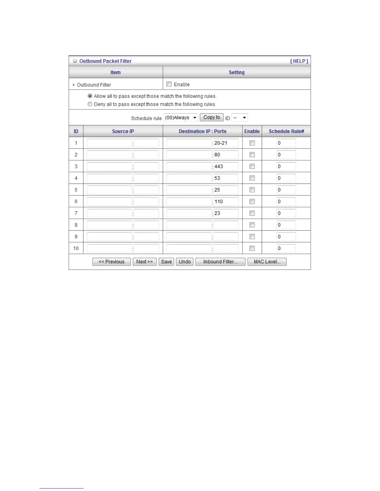 Packet Filter enables you to control what packets are allowed to pass the router. Outbound
