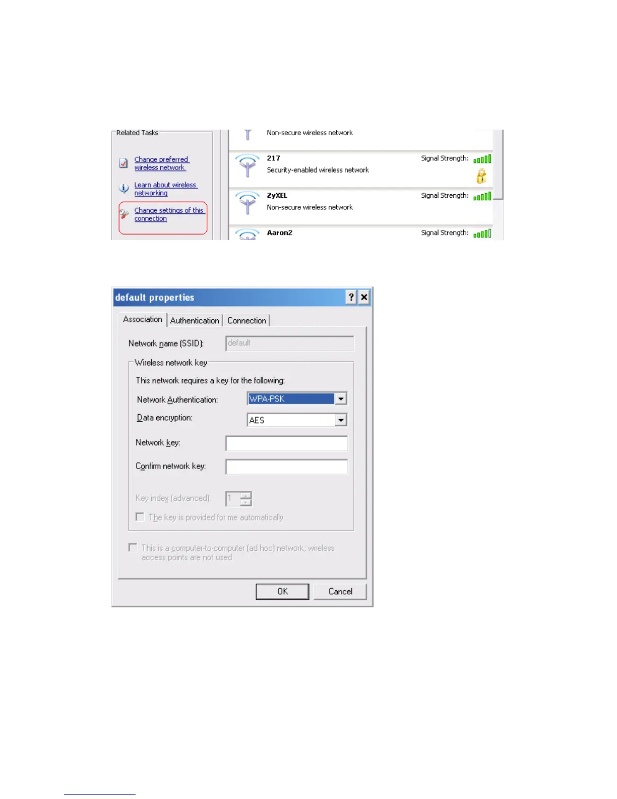 If SSID is default and click “Properties” to check if the driver of wireless client supports AES