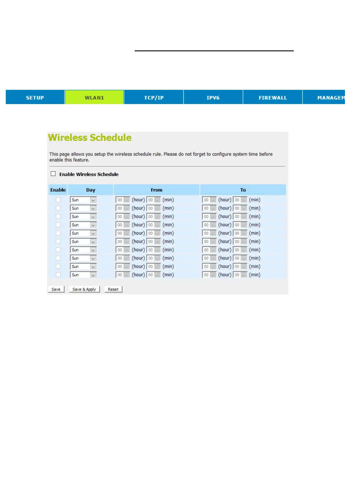 This page allows you setup the wireless schedule rule. Please