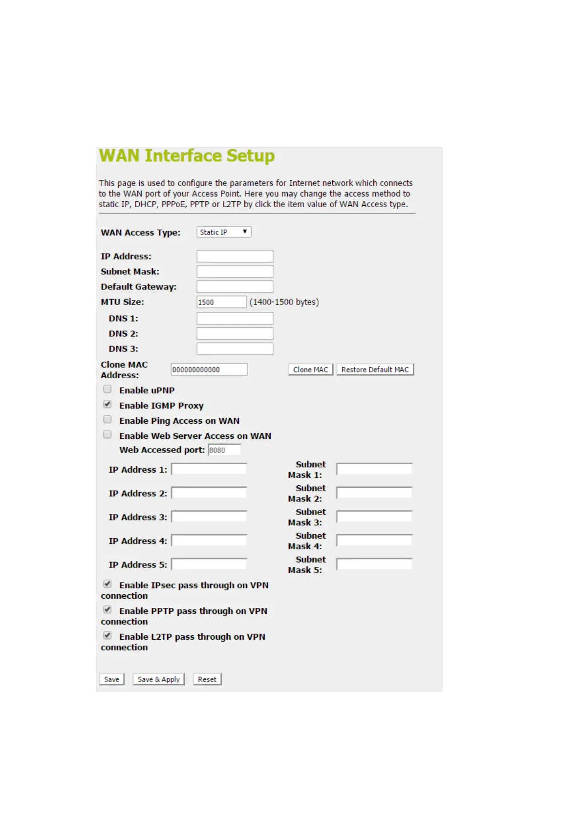 4. EnterWAN IP Address,WAN Subnet Mask, Default
