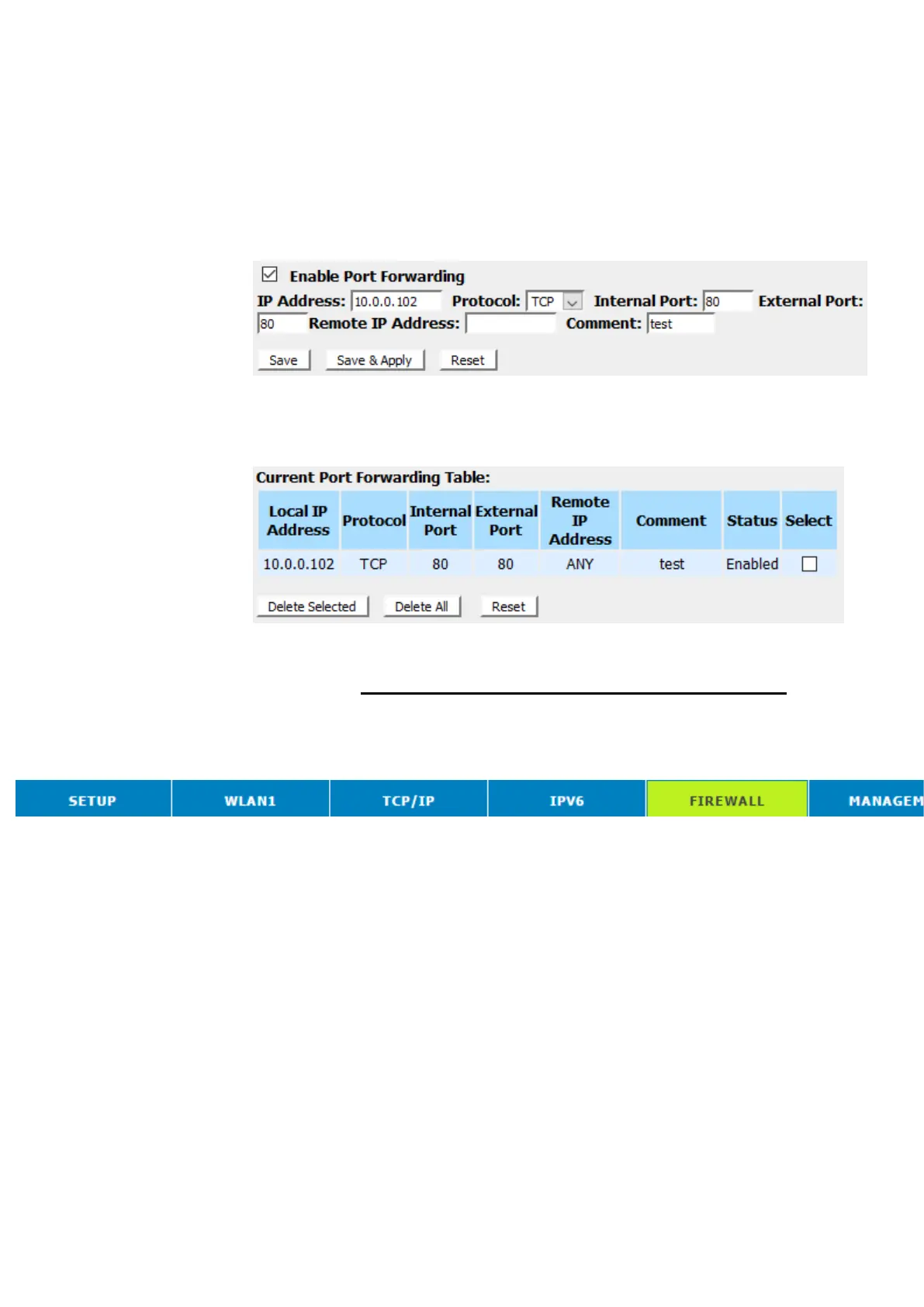 Please follow example below to configure the Port Forwarding