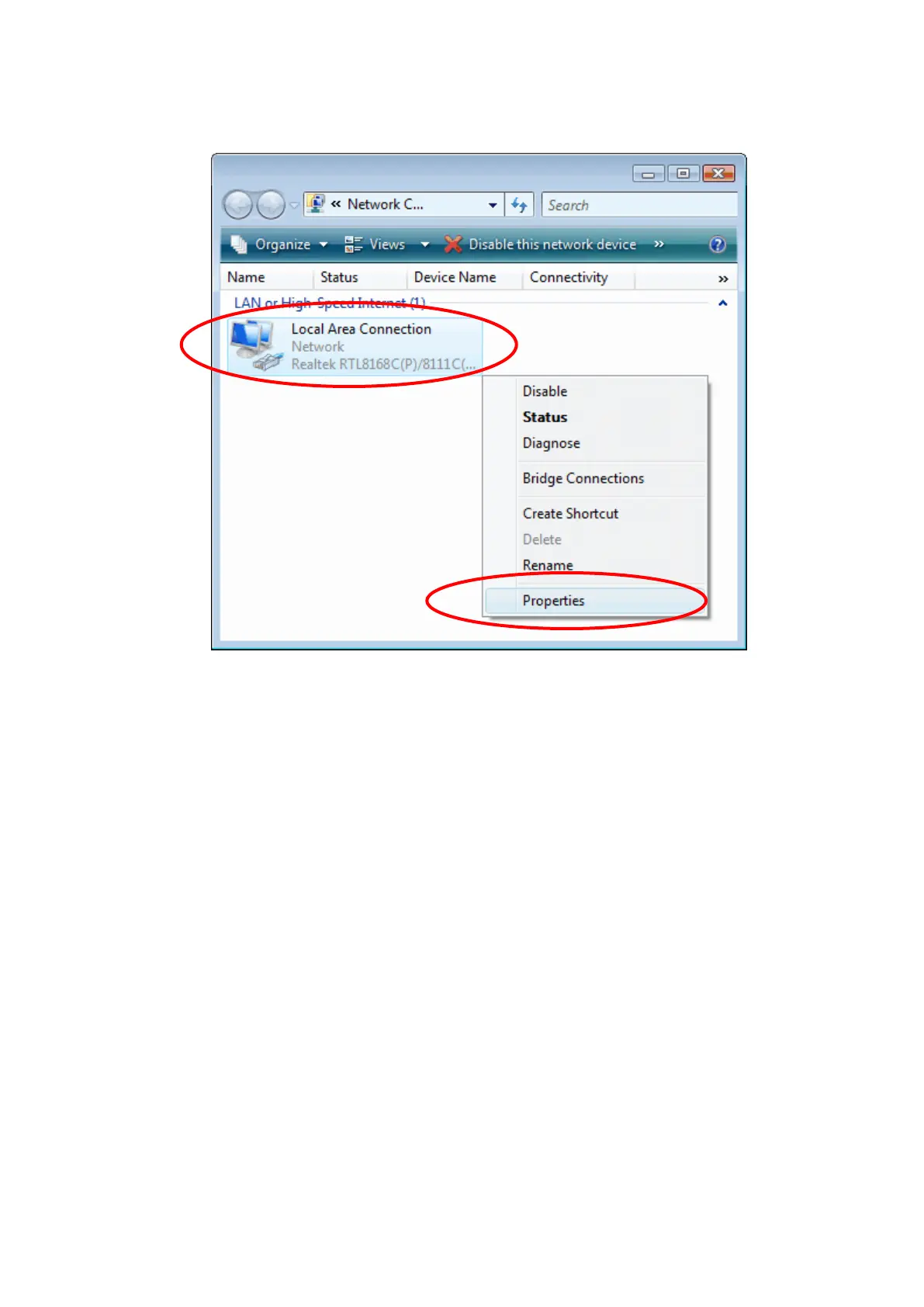 3. Single RIGHT click on "Local Area connection", then click