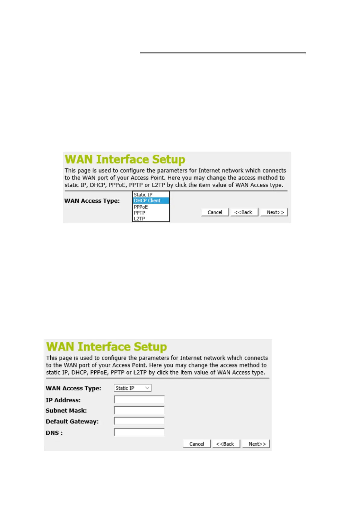 DHCP Client, PPPoE, PPTP, or L2TPsetting determined by