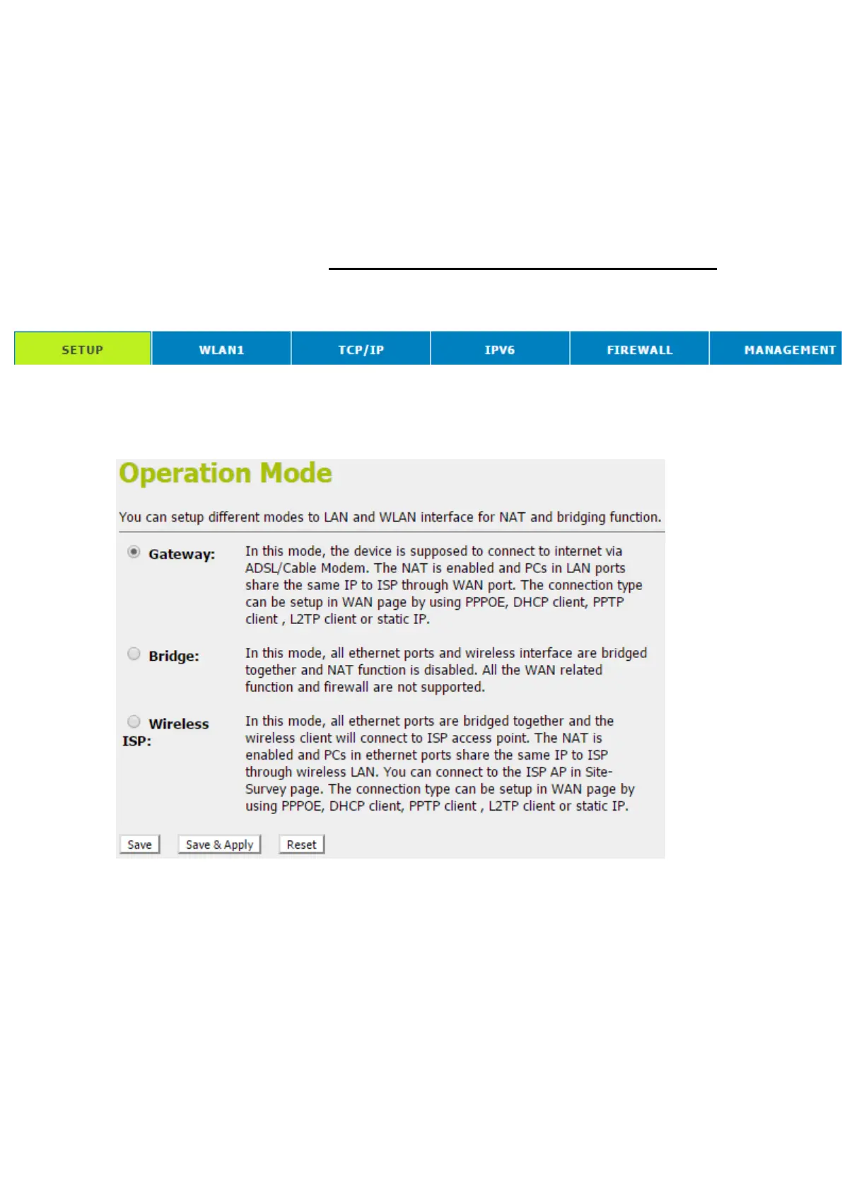 Operation Mode: Gateway, Bridgeand Wireless ISP.