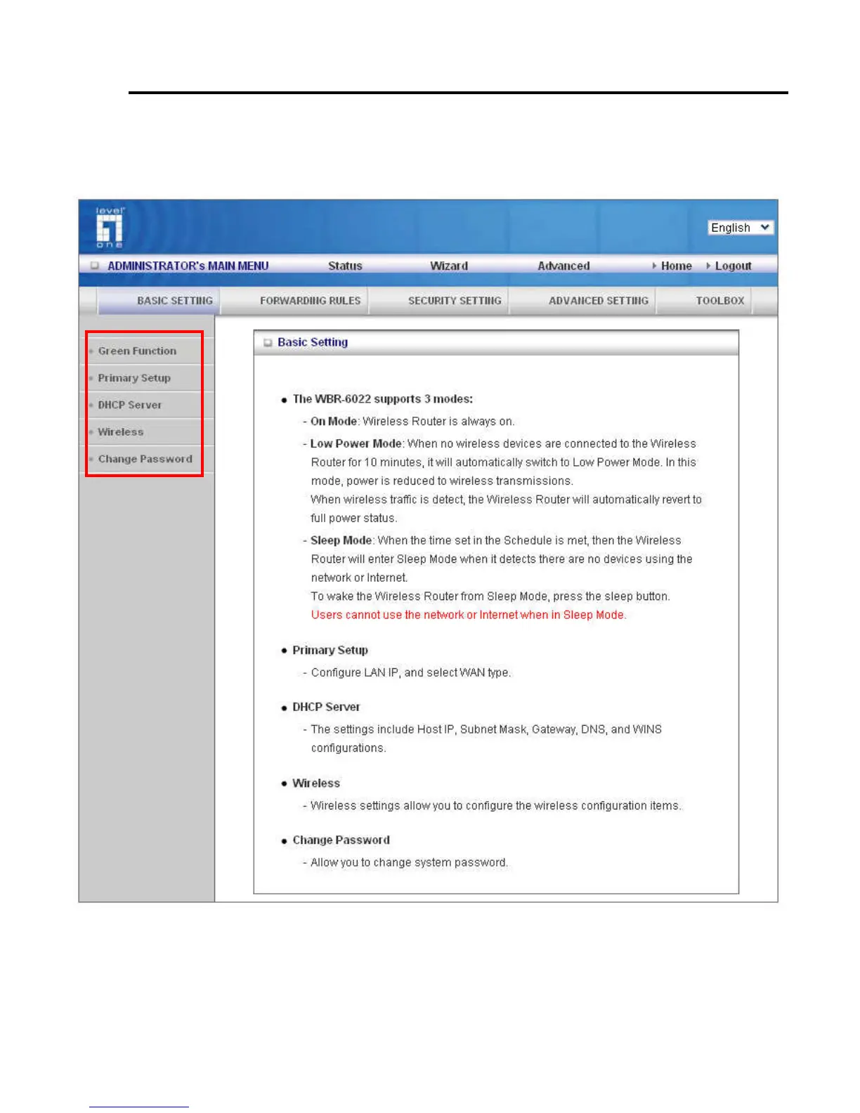 LevelOne WBR-6022 - Basic Settings Configuration; Primary Setup; Wireless Basic Settings; Change System Password