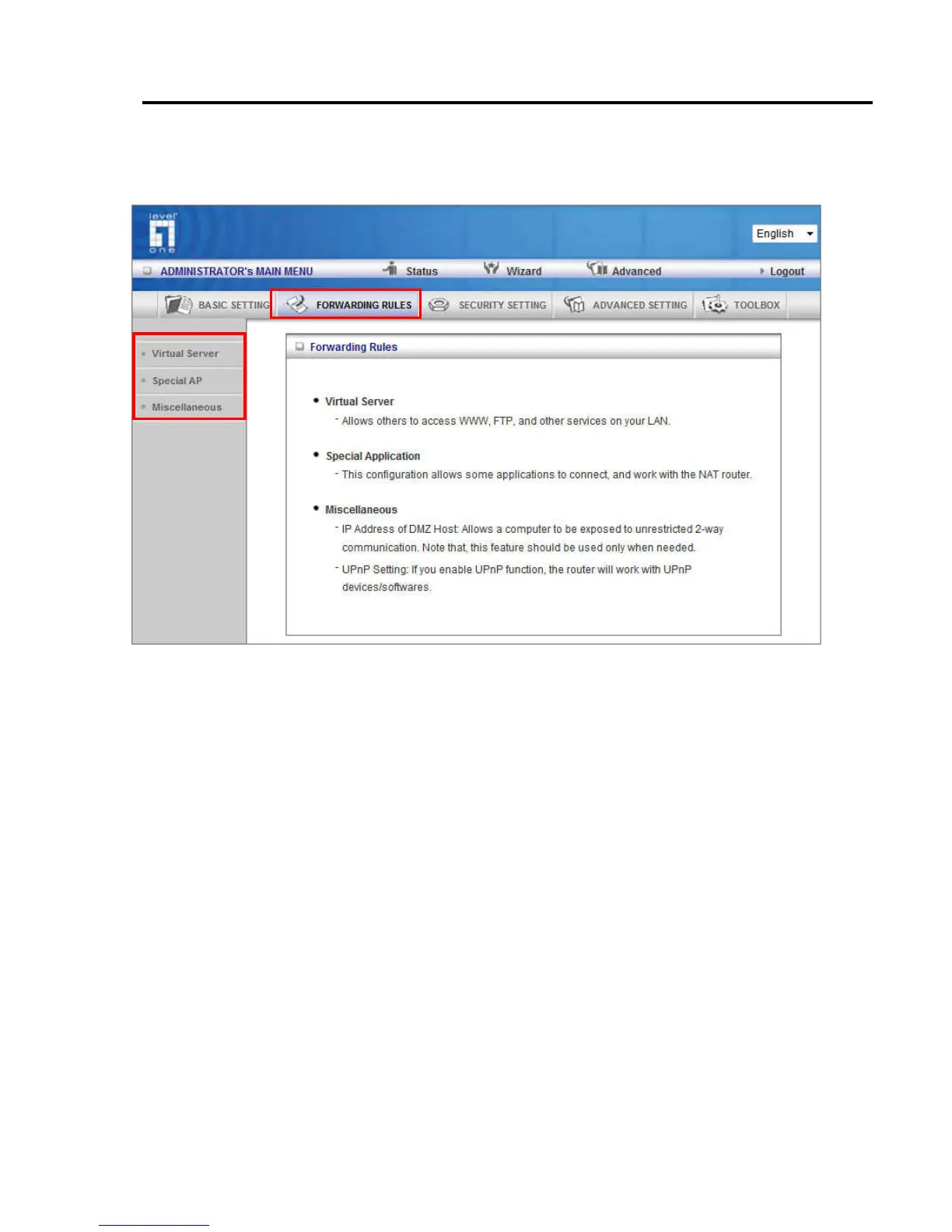Forwarding (Virtual Server), Port Triggering (Special AP page) and DMZ Host (Miscellaneous page).