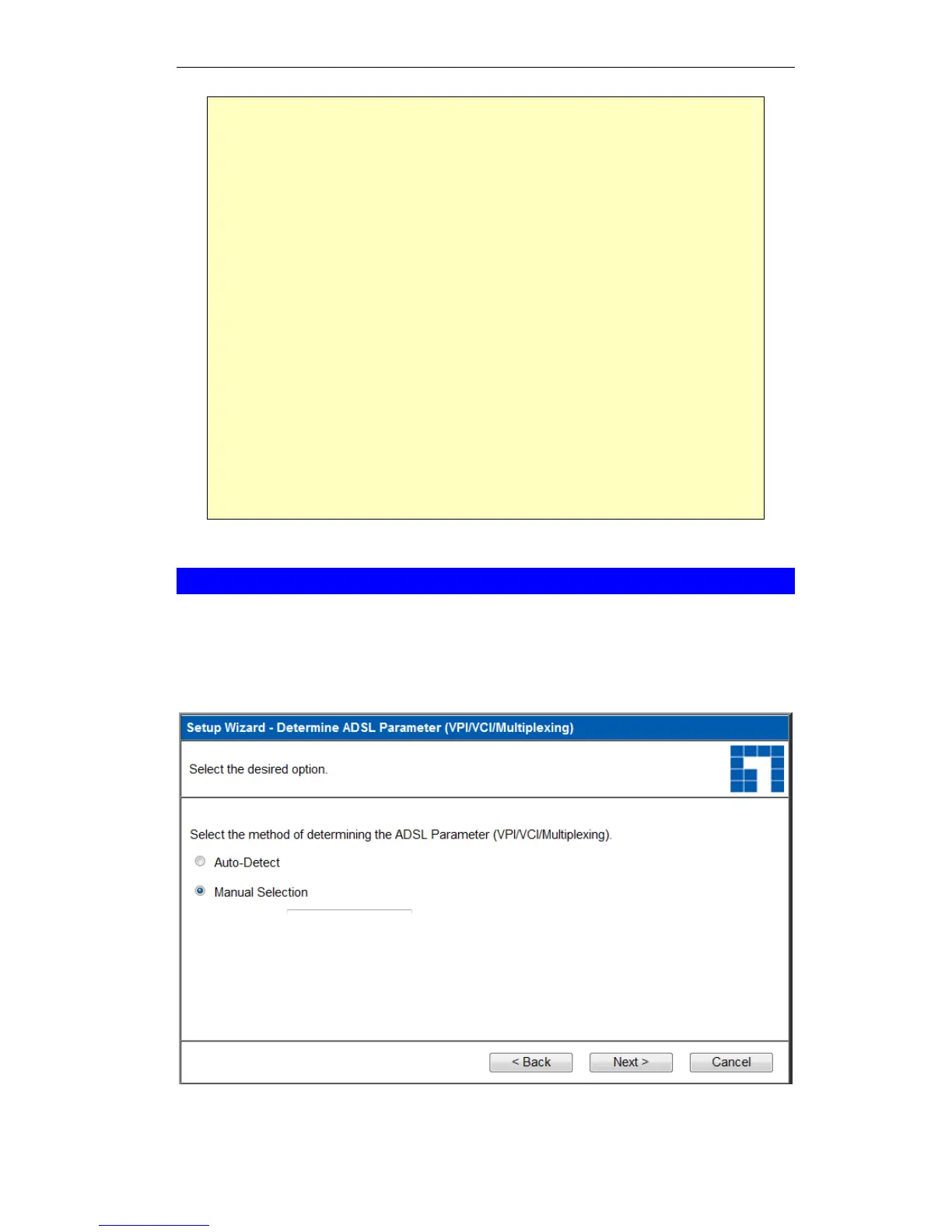 The first time you connect to the Wireless ADSL Router, you should run the Setup Wizard to