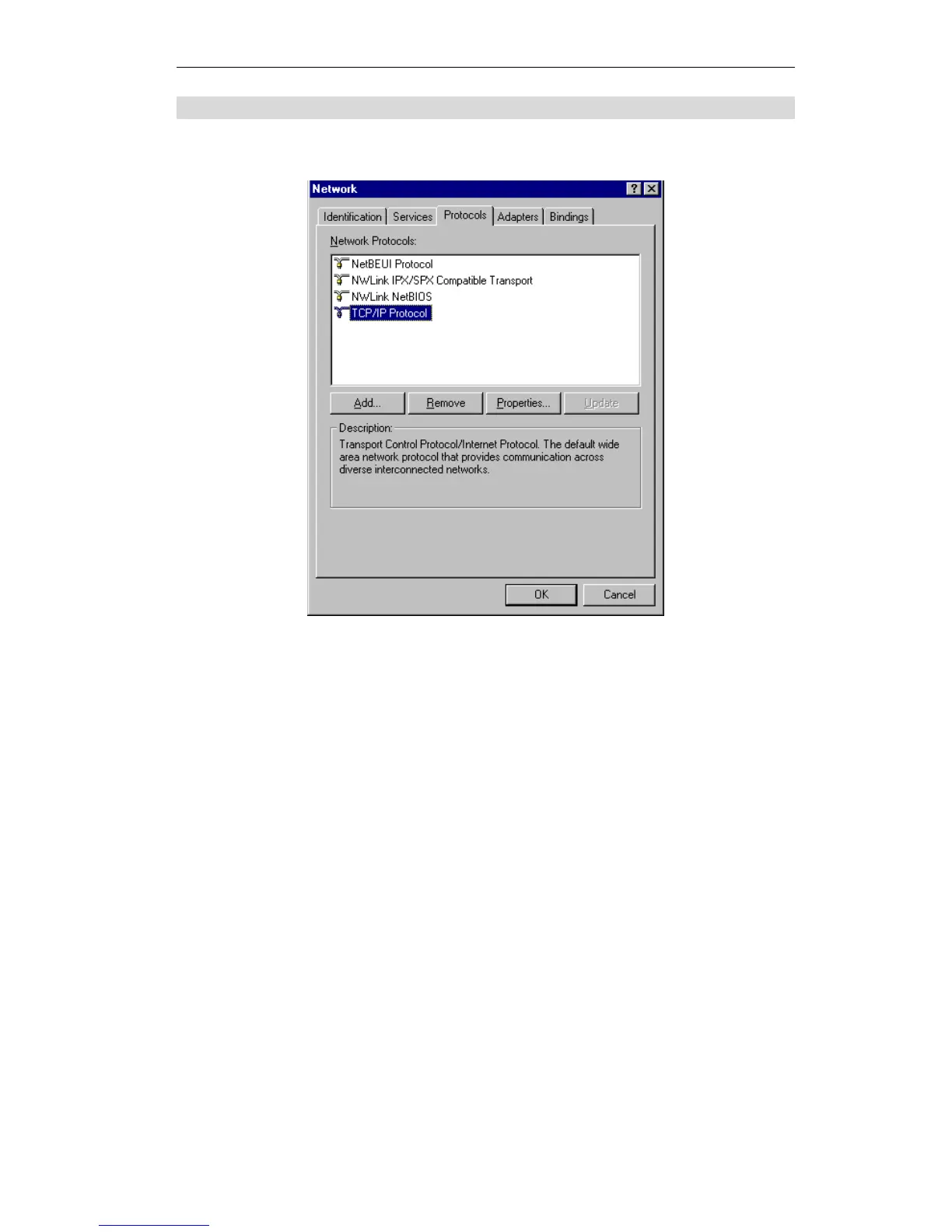 1. Select Control Panel - Network, and, on the Protocols tab, select the TCP/IP protocol, as