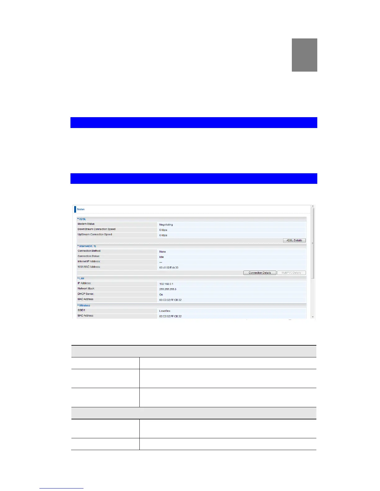 This Chapter details the operation of the Wireless ADSL Router and the status