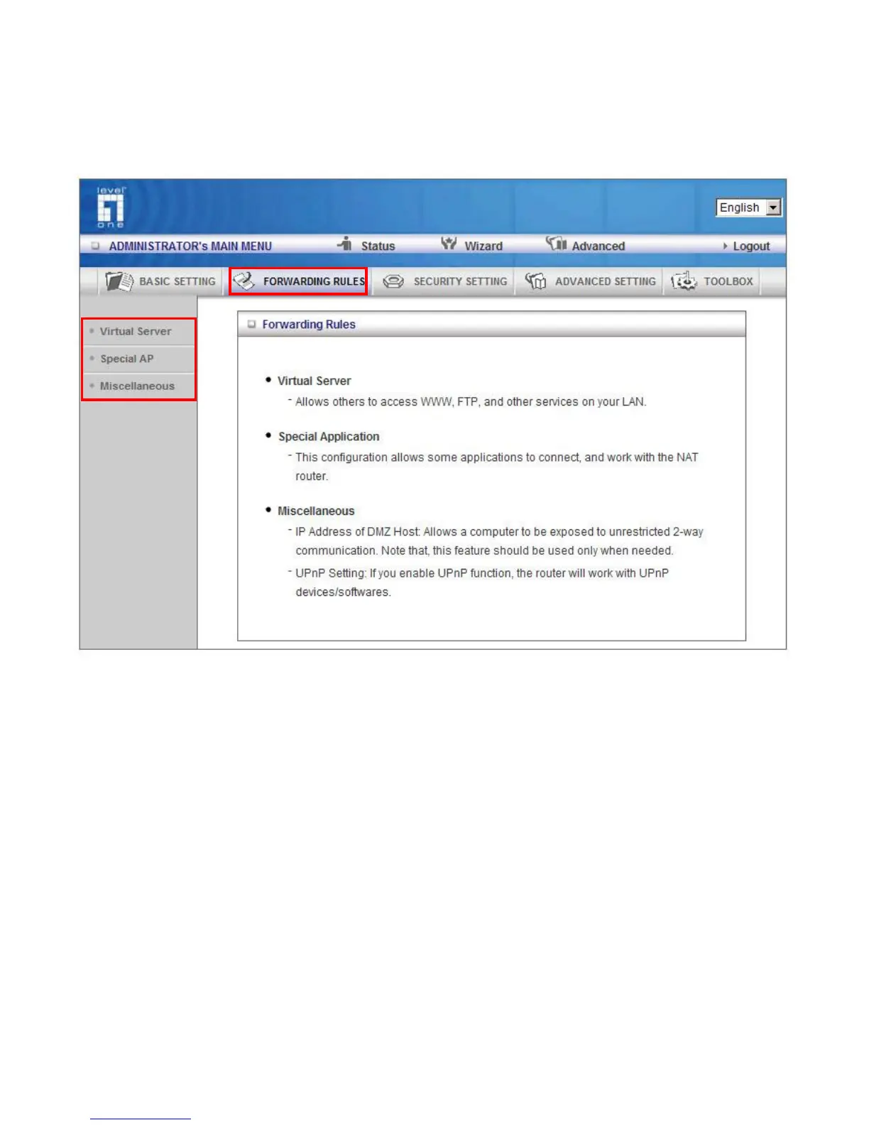 Forwarding (Virtual Server), Port Triggering (Special AP page) and DMZ Host (Miscellaneous page).