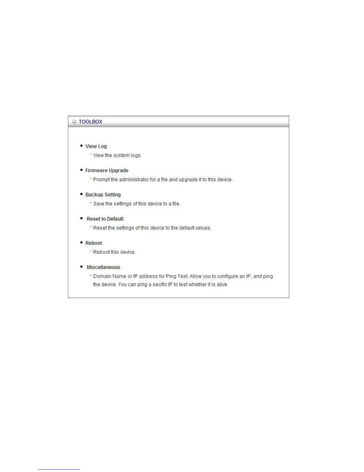LevelOne WBR-6801 - Advanced Settings - Toolbox Functions; Toolbox Functions Overview; Firmware Upgrade & Backup; Reset to Default & Reboot