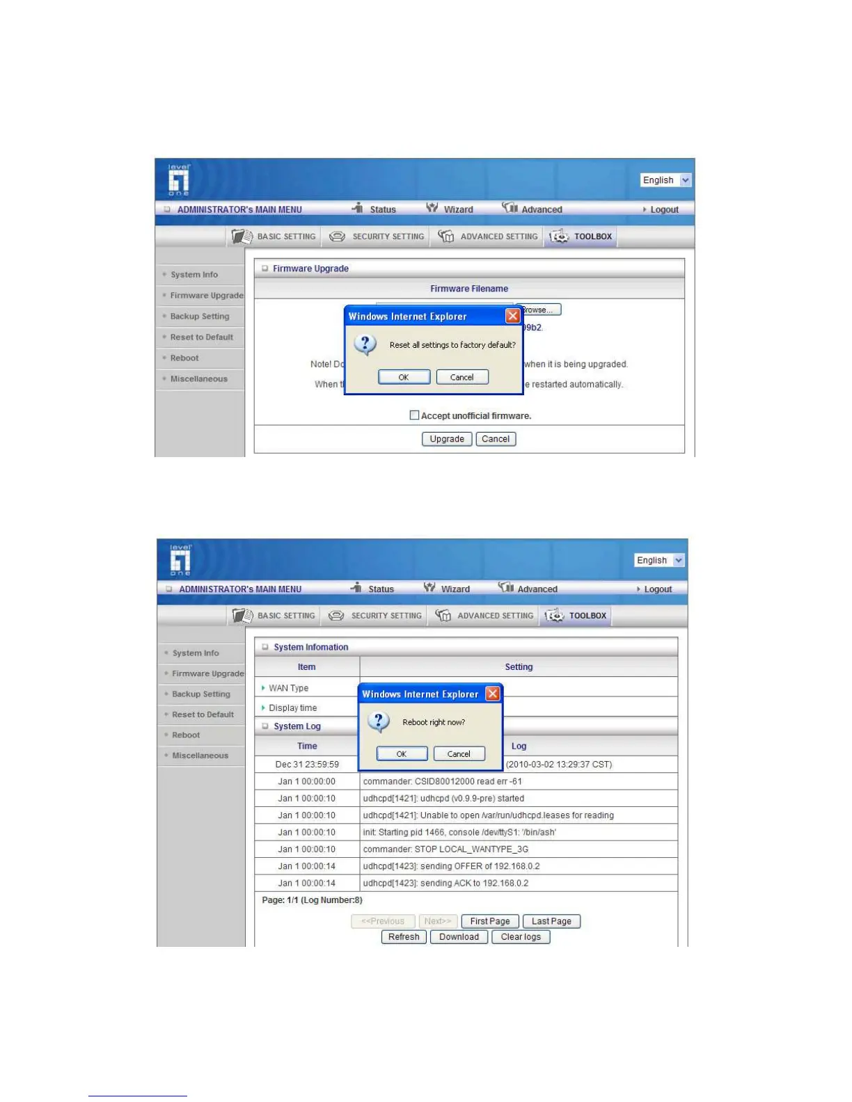 LevelOne WBR-6801 - Device Reset and Reboot; Reset to Default Procedure; Reboot Device Procedure