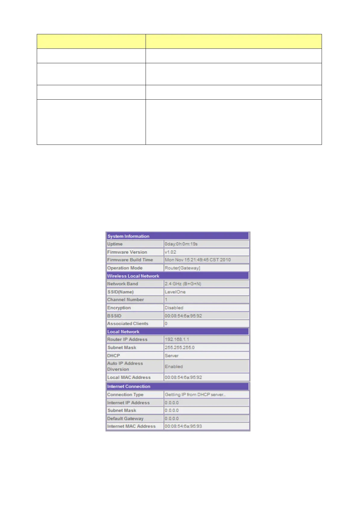 This information page shows the current status and basic settings of this device. You could check