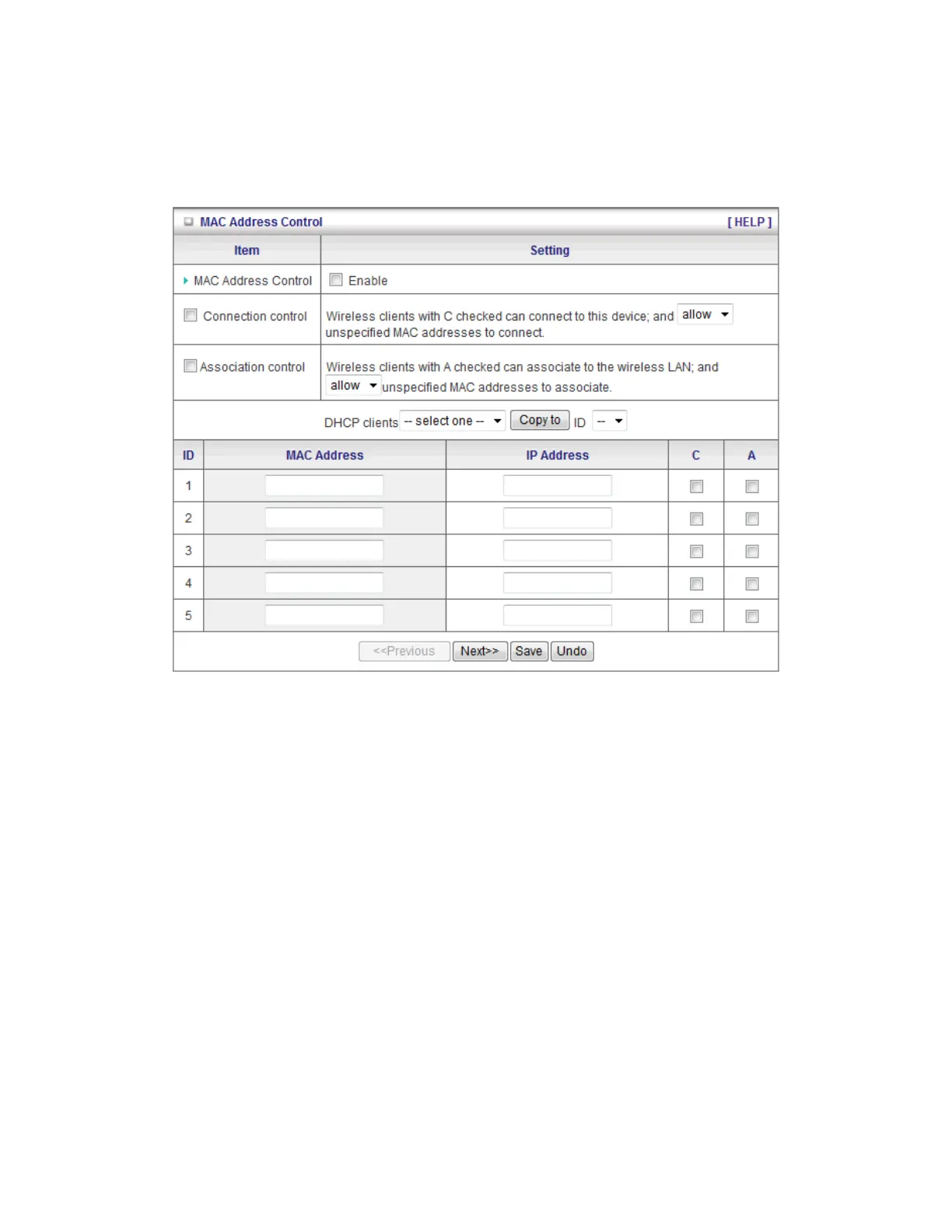 1. MAC Address Control: Check “Enable” to enable the “MAC Address Control”. All of the