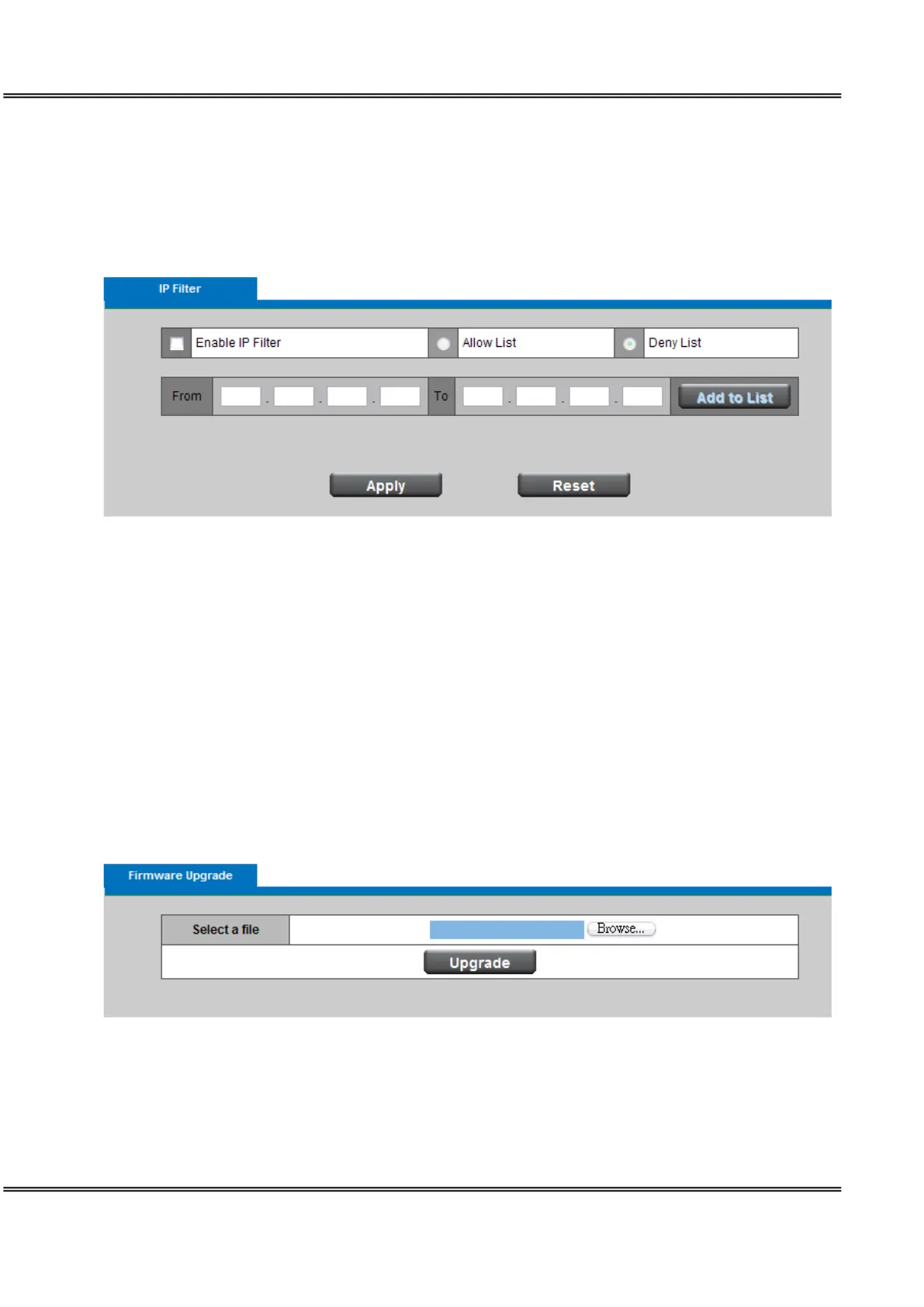 Upgrade - Click Browse… and specify the firmware file. Click Upgrade. The Network