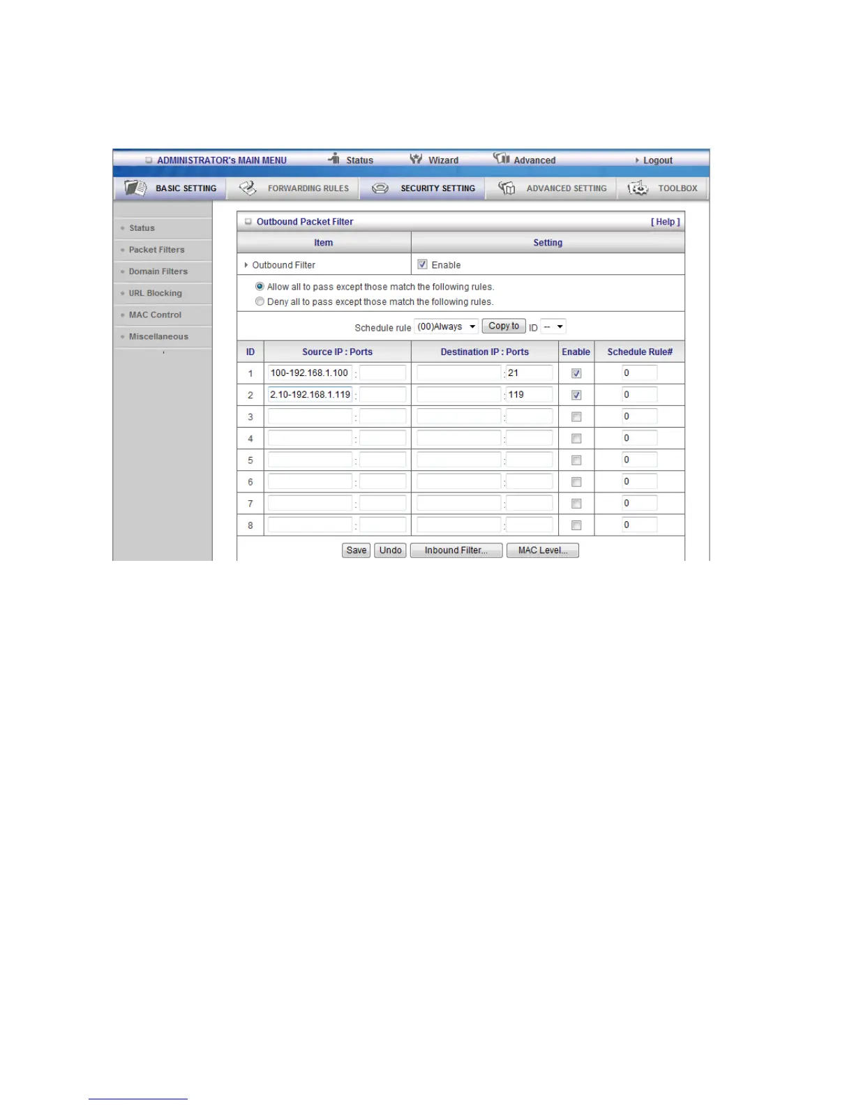 After Outbound Packet Filter setting is configured, click the save button.