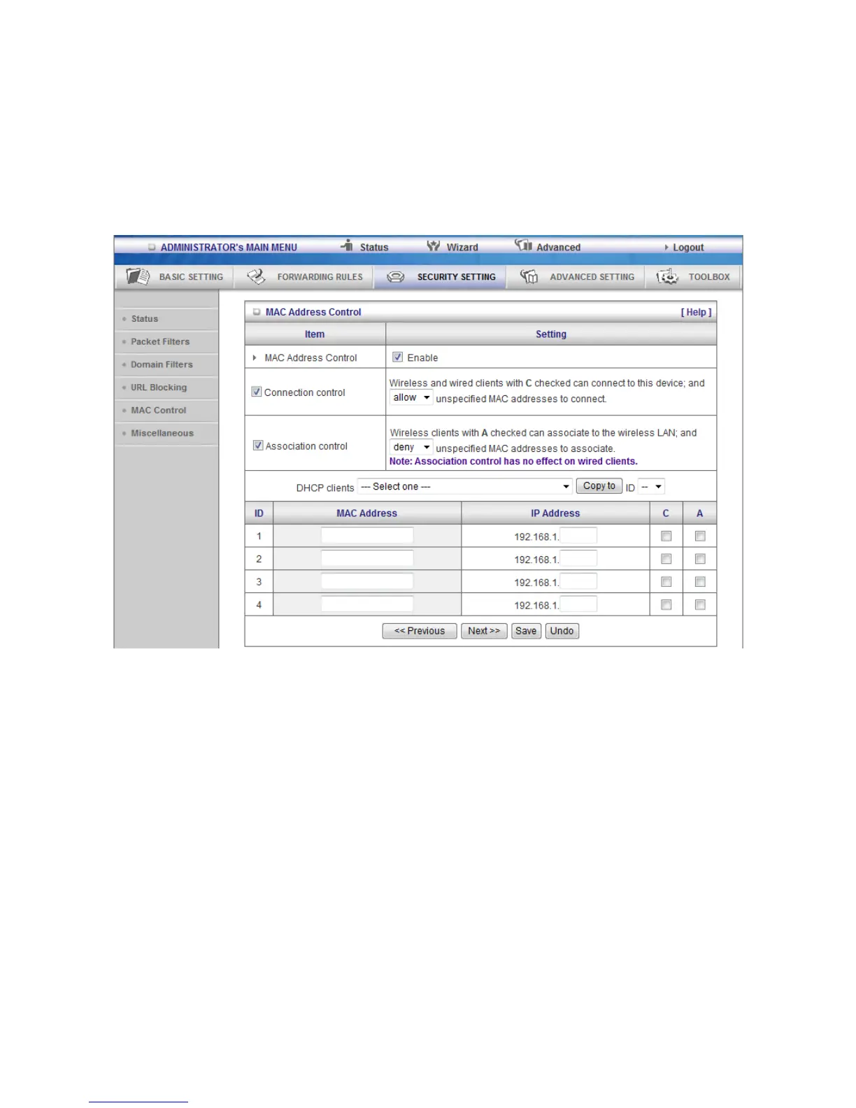 MAC Address Control Check “Enable” to enable the “MAC Address Control”. All of the settings in
