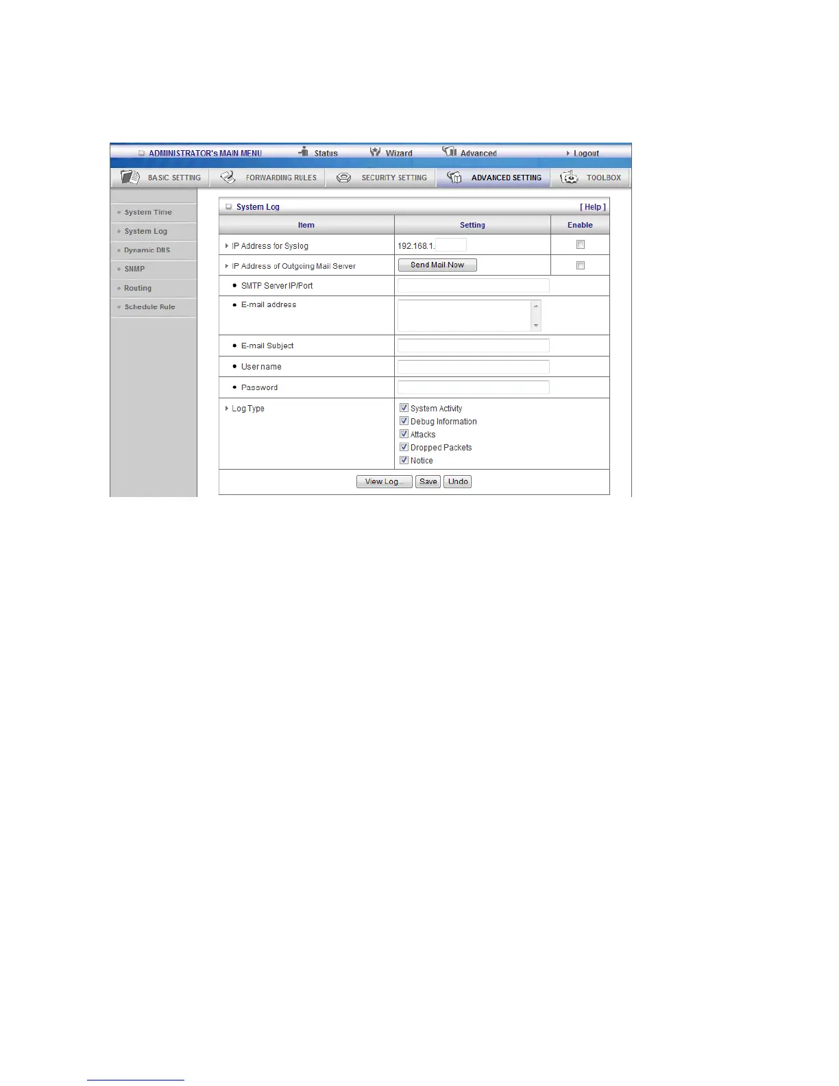 This page support two methods to export system logs to specific destination by means of syslog(UDP) and