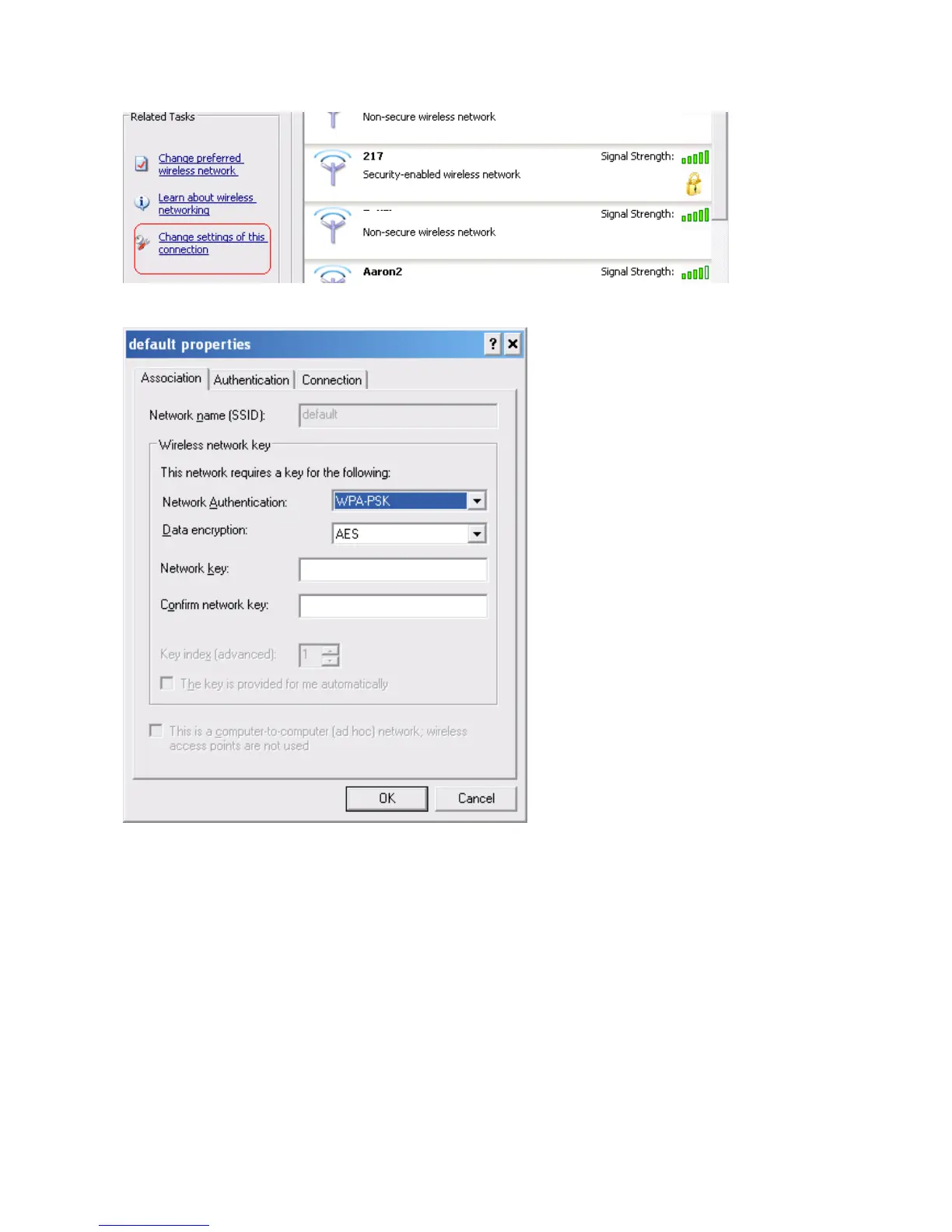 If SSID is default and click “Properties” to check if the driver of wireless client supports AES encryption.