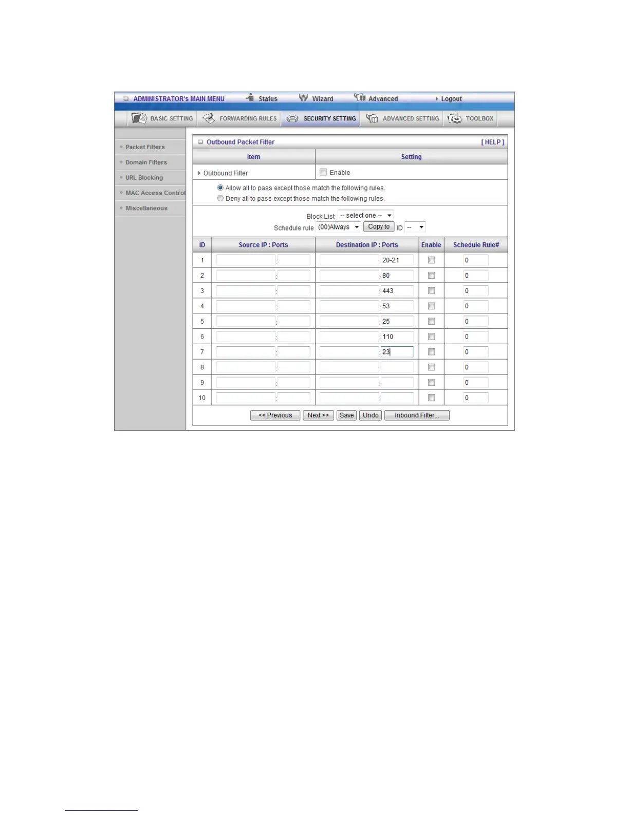 Packet Filter enables you to control what packets are allowed to pass the router. Outbound