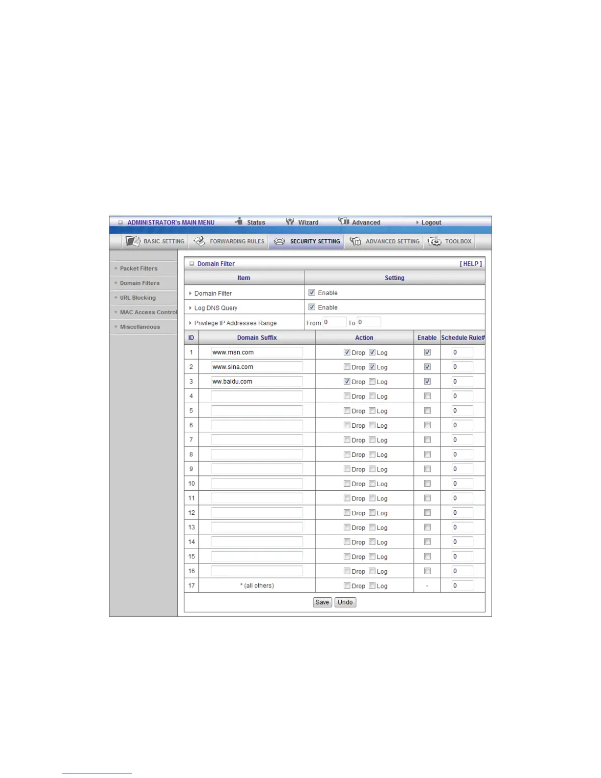 1. URL include “www.msn.com” will be blocked, and the action will be record in log-file.