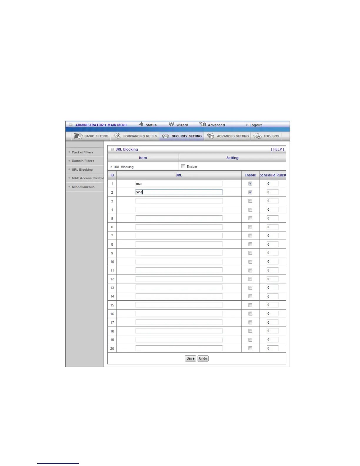 1. URL include “msn” will be blocked, and the action will be record in log-file.