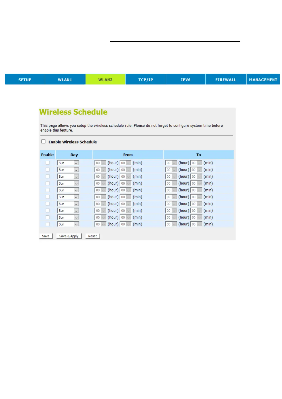This page allows you setup the wireless schedule rule. Please