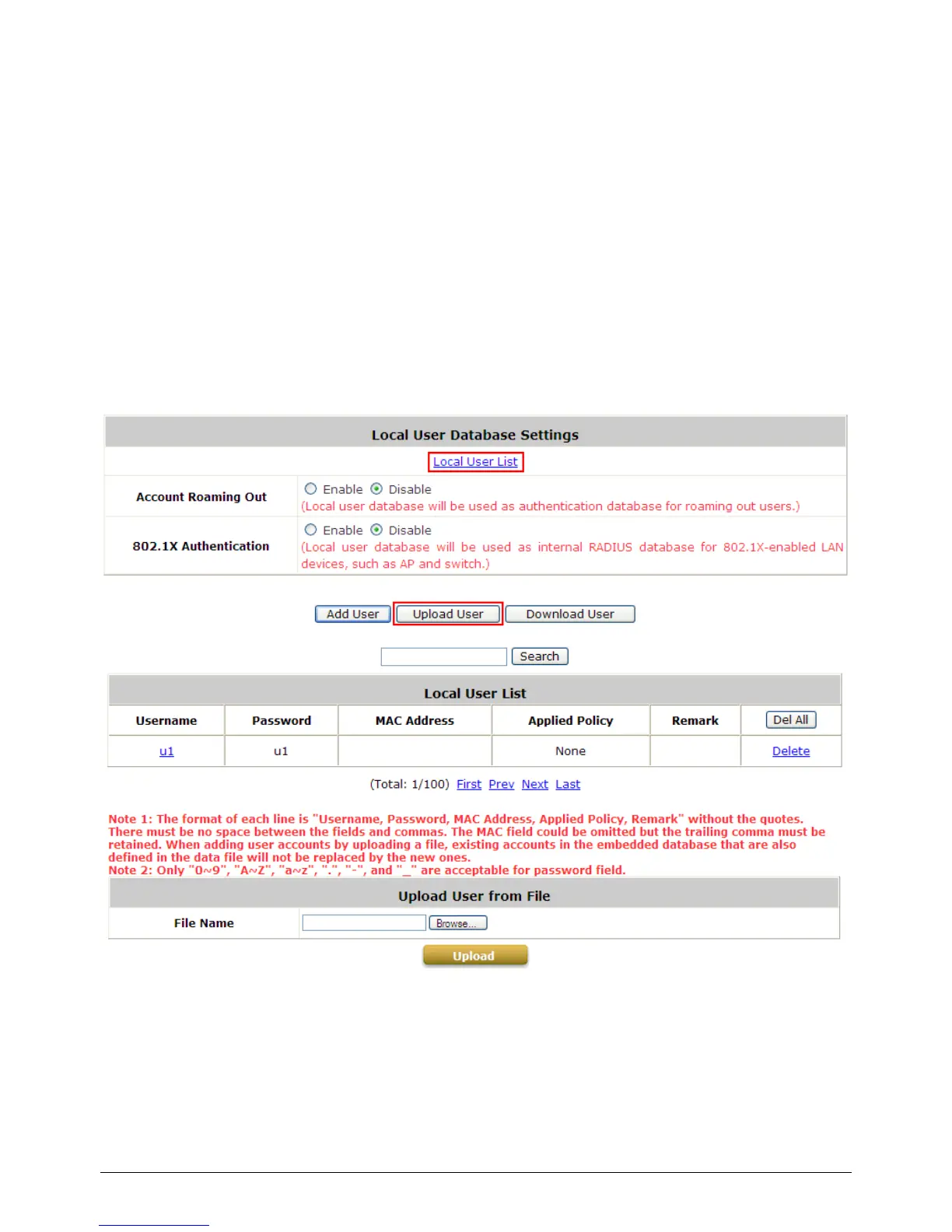 To Upload / Download Local Users Accounts, go to: Users >> Authentication, click Configure