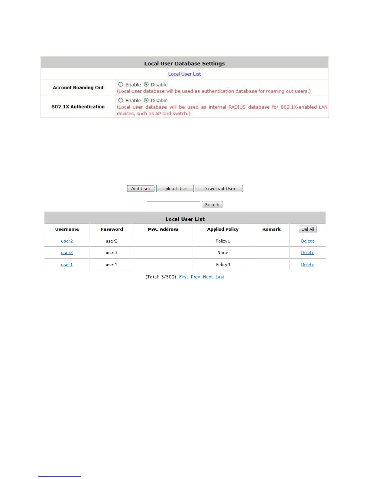 Local User List: It let the administrator to view, add or delete local user account. The Upload