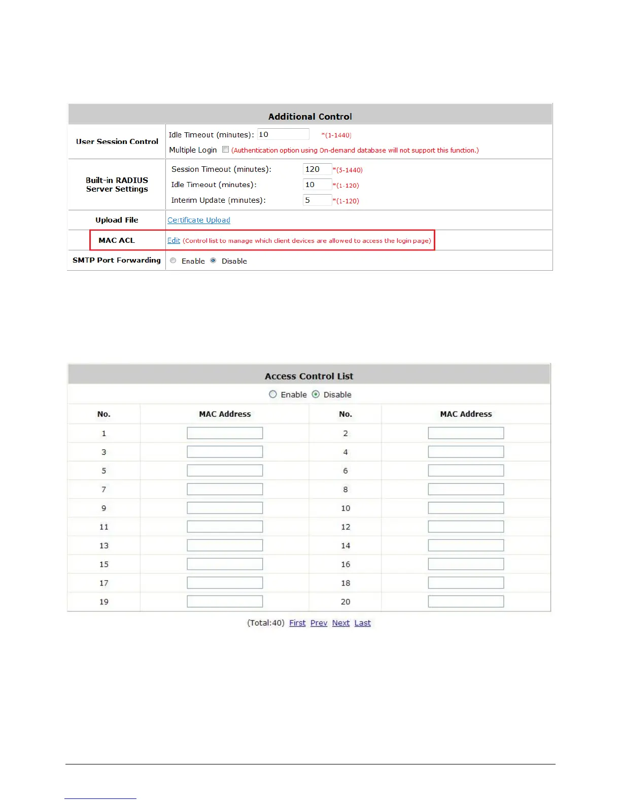 MAC ACL: With this function, only the users with their MAC addresses in this list can login to