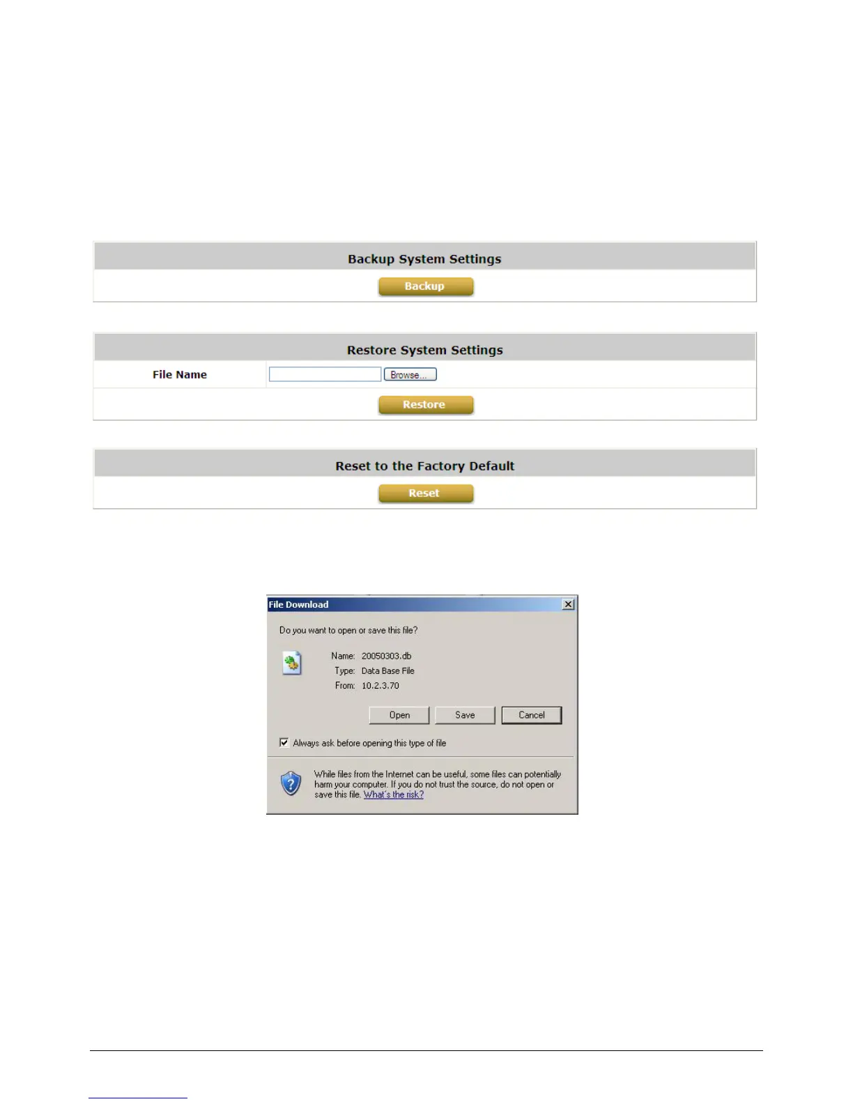Backup System Settings: Click Backup to create a .db database backup file and save it on disk.